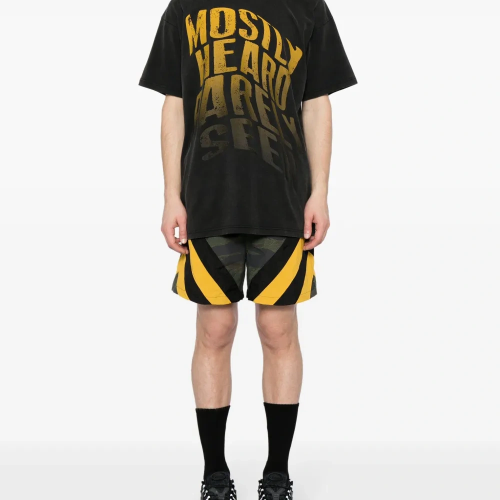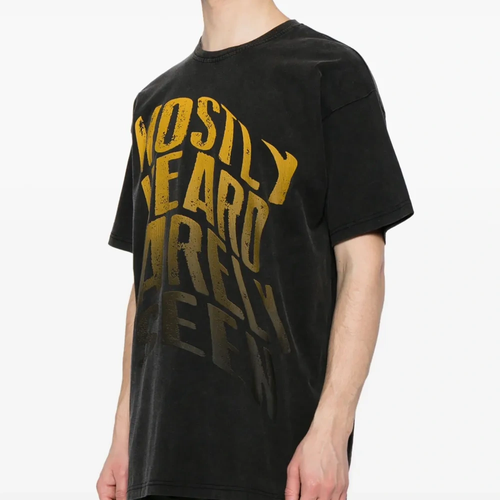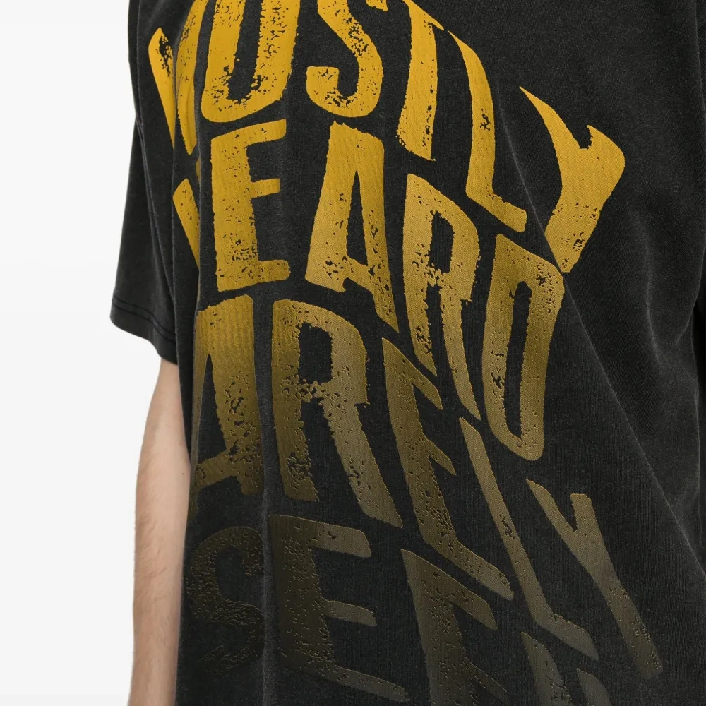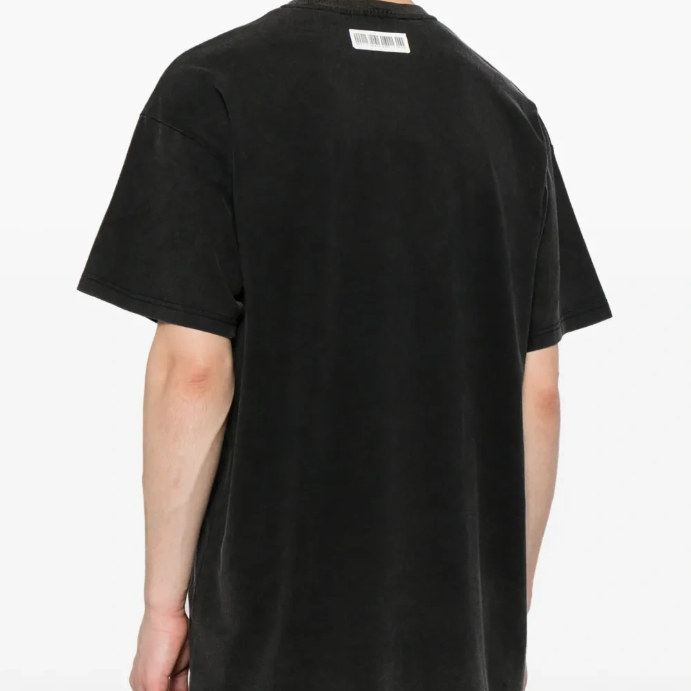 Черный, хлопок, логотип спереди, эффект потертости, принт с изображением штрихкода, круглый вырез, короткие рукава и прямой подол.