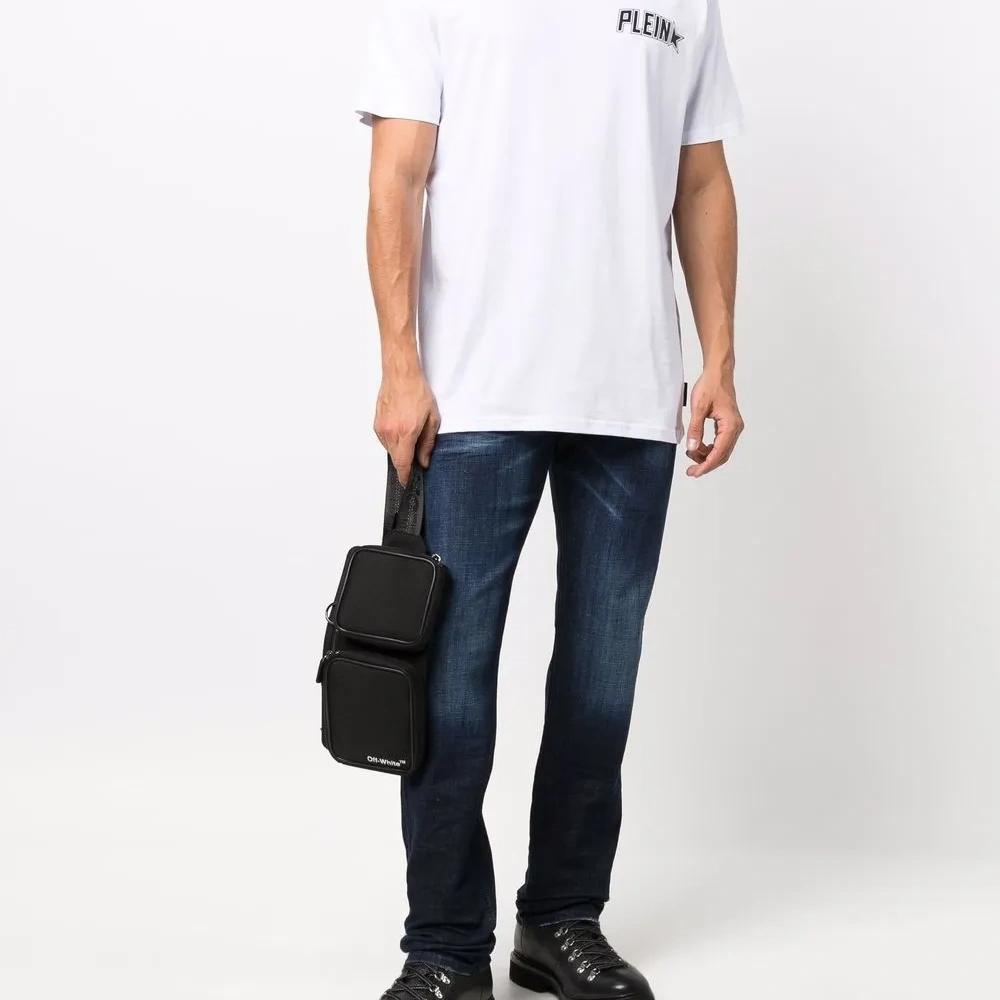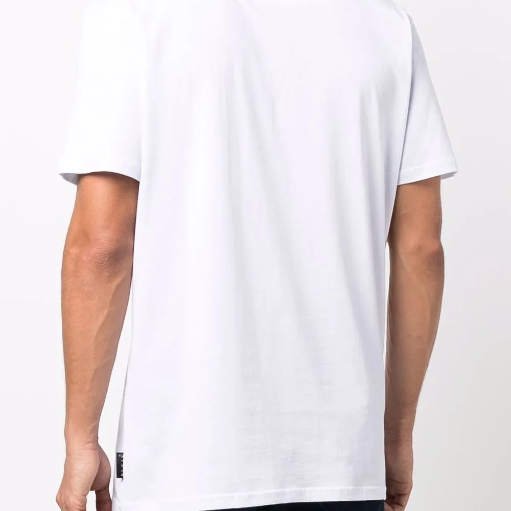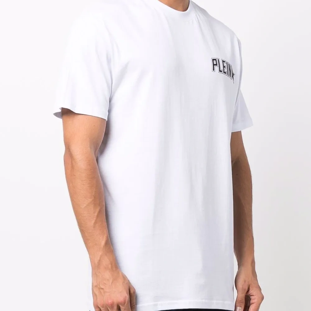 Принт с логотипом на груди, нашивка с логотипом сзади, круглый вырез, короткие рукава и прямой подол. Цвет: белый.
