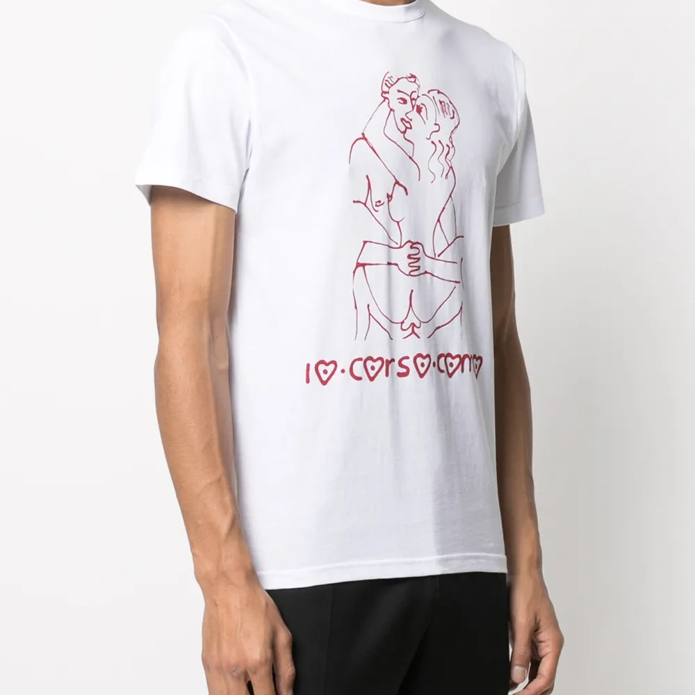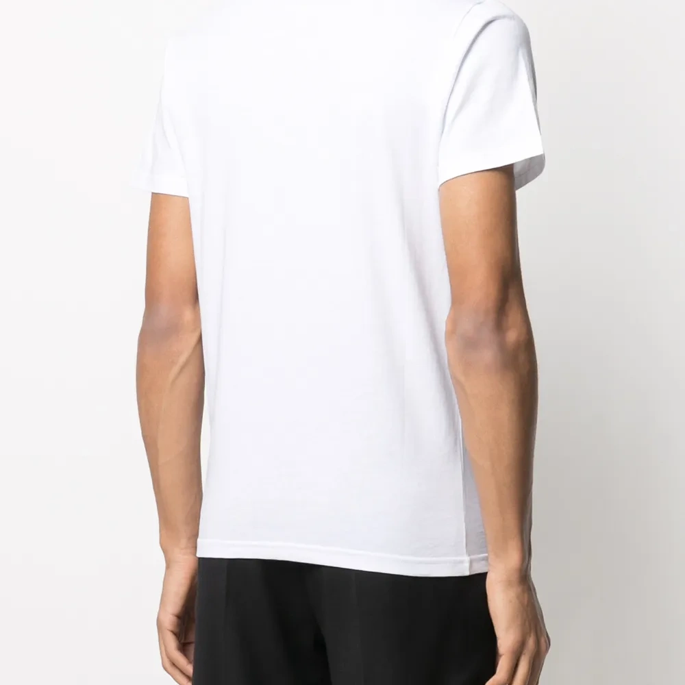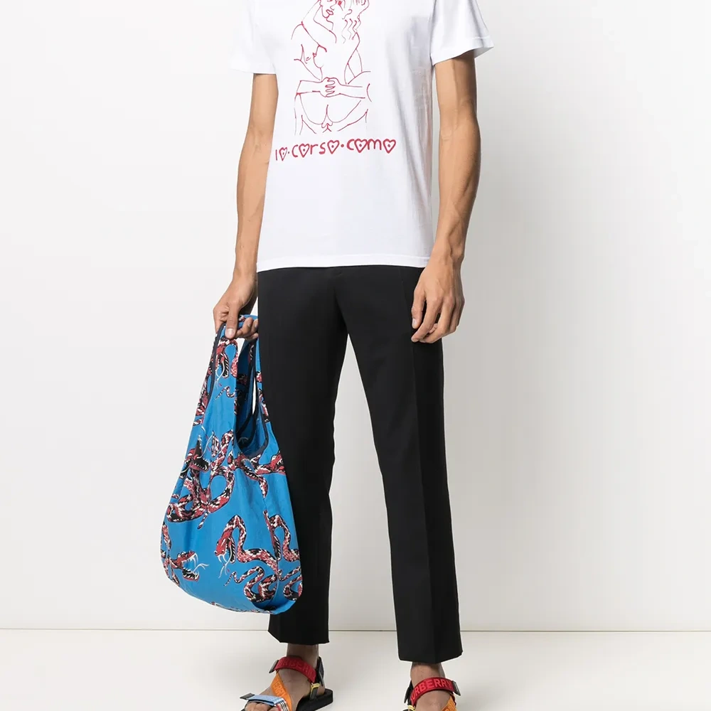 Круглый вырез, графичный принт, короткие рукава и прямой подол.