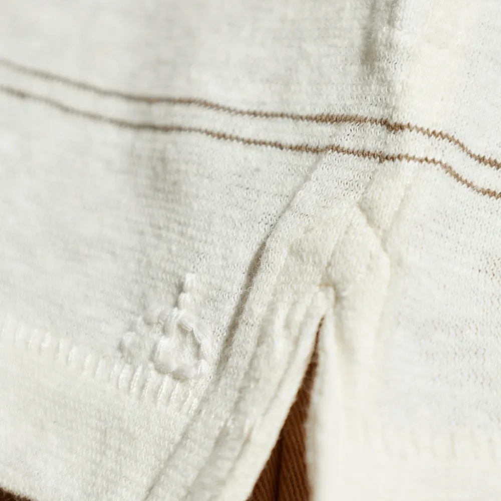 белая футболка в полоску с короткими рукавами, круглым вырезом и разрезами по бокам