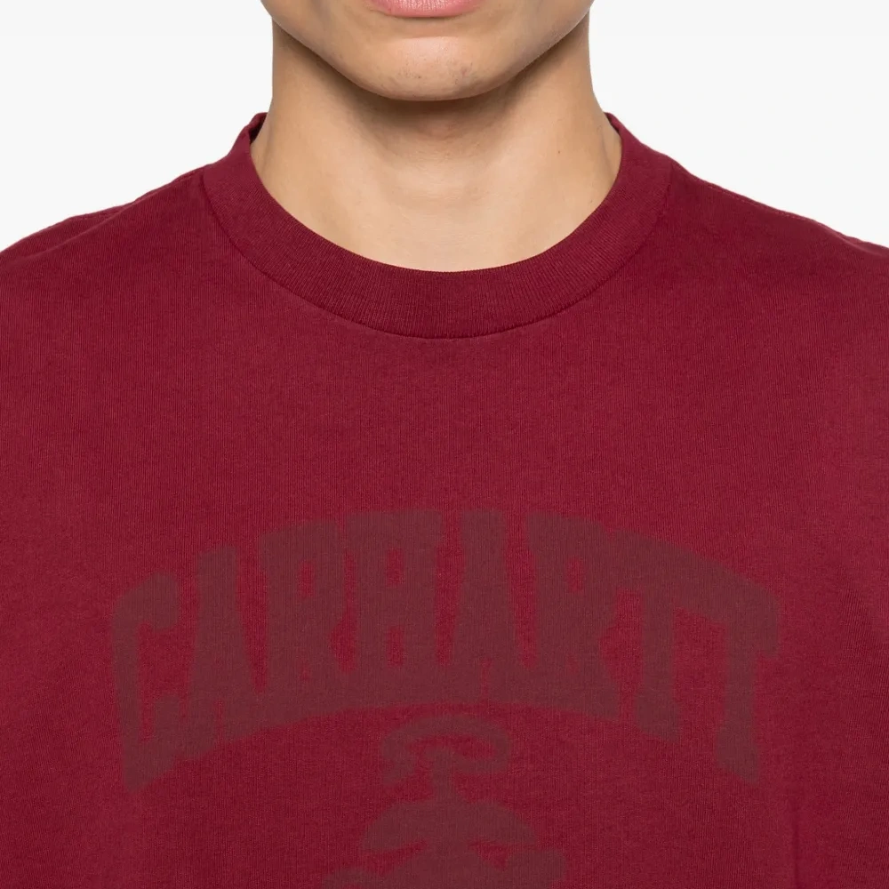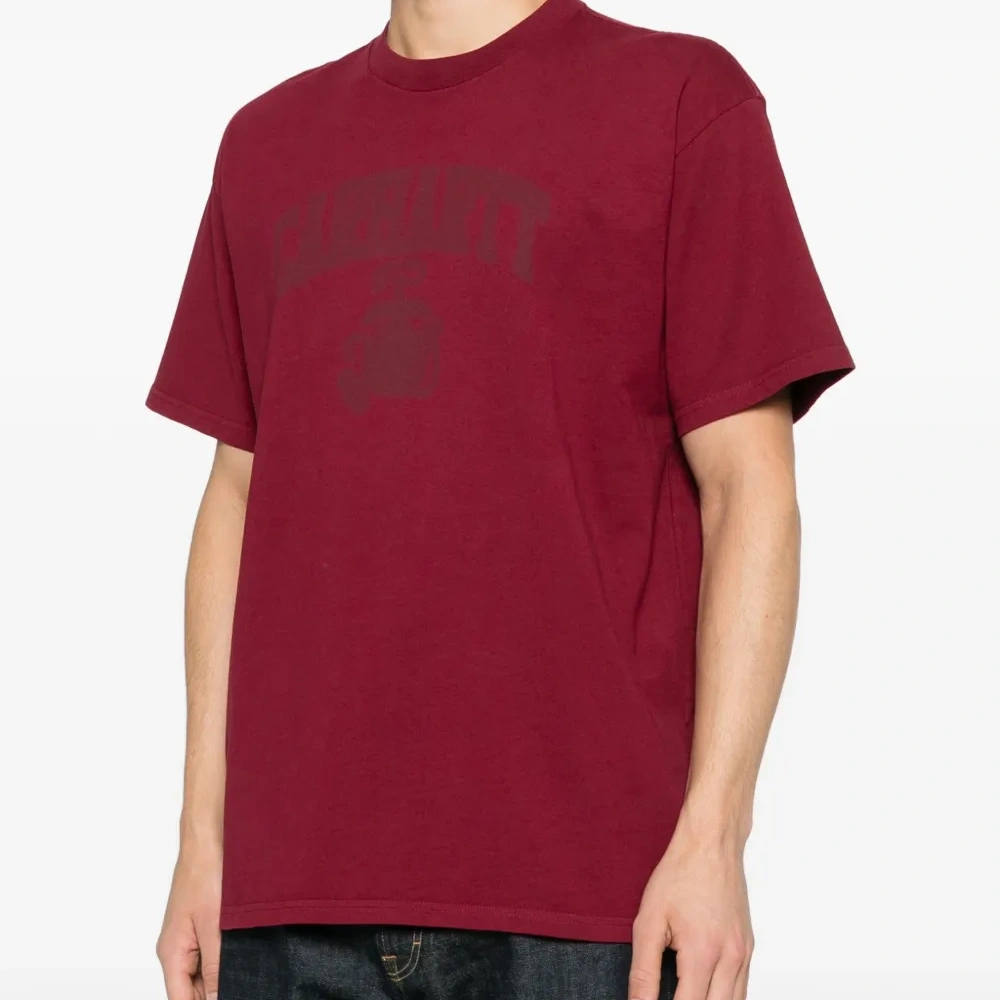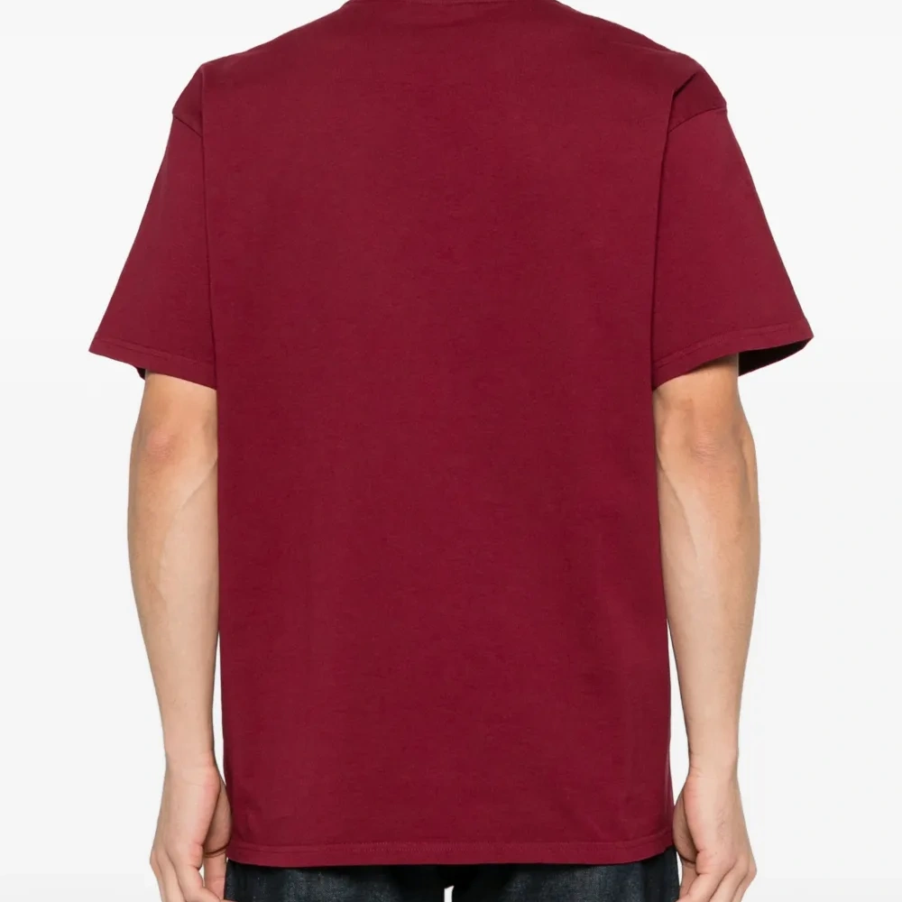красная футболка с логотипом, короткими рукавами и круглым вырезом
