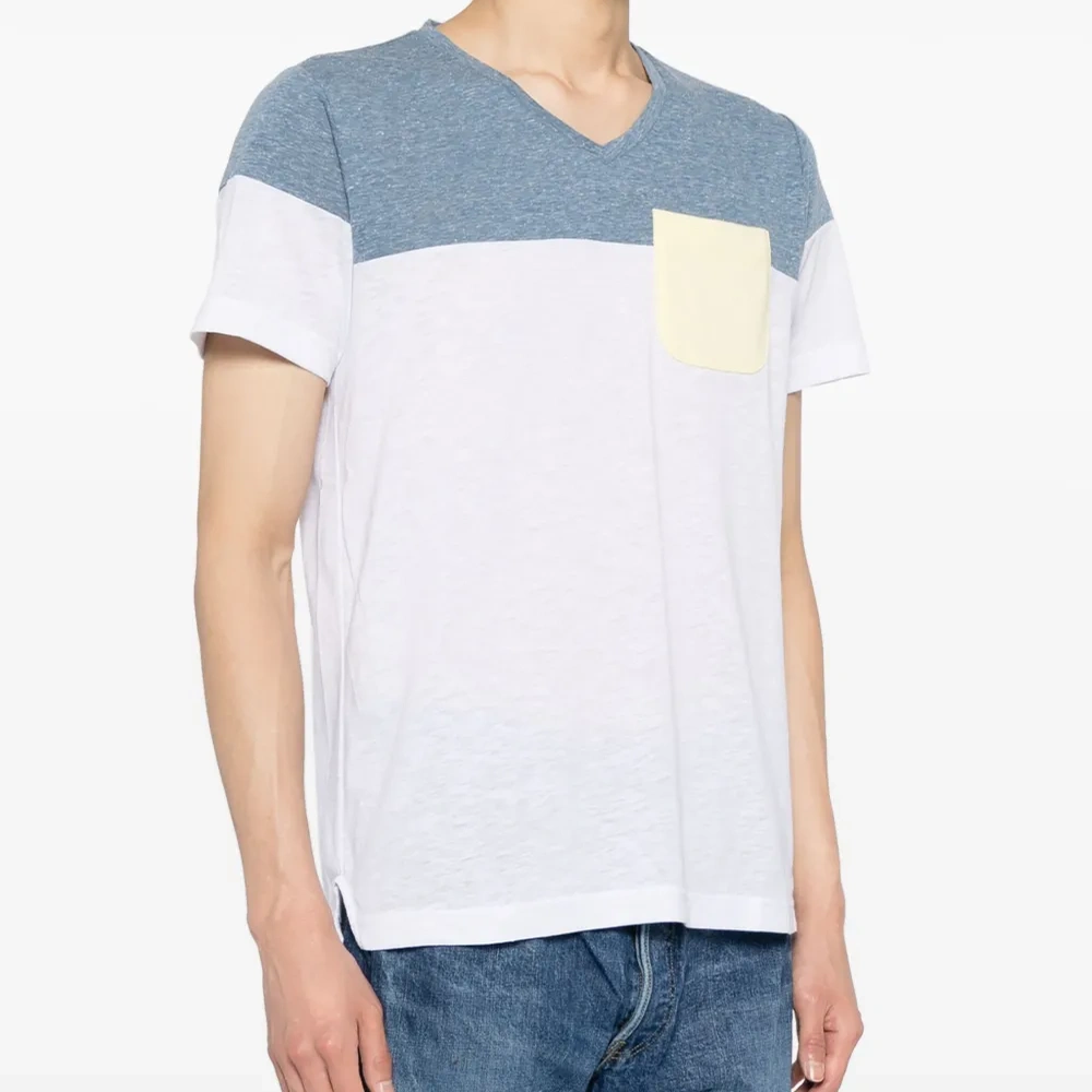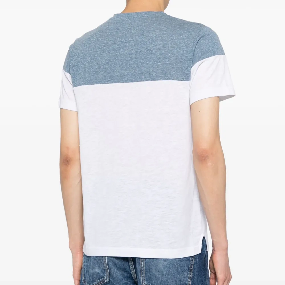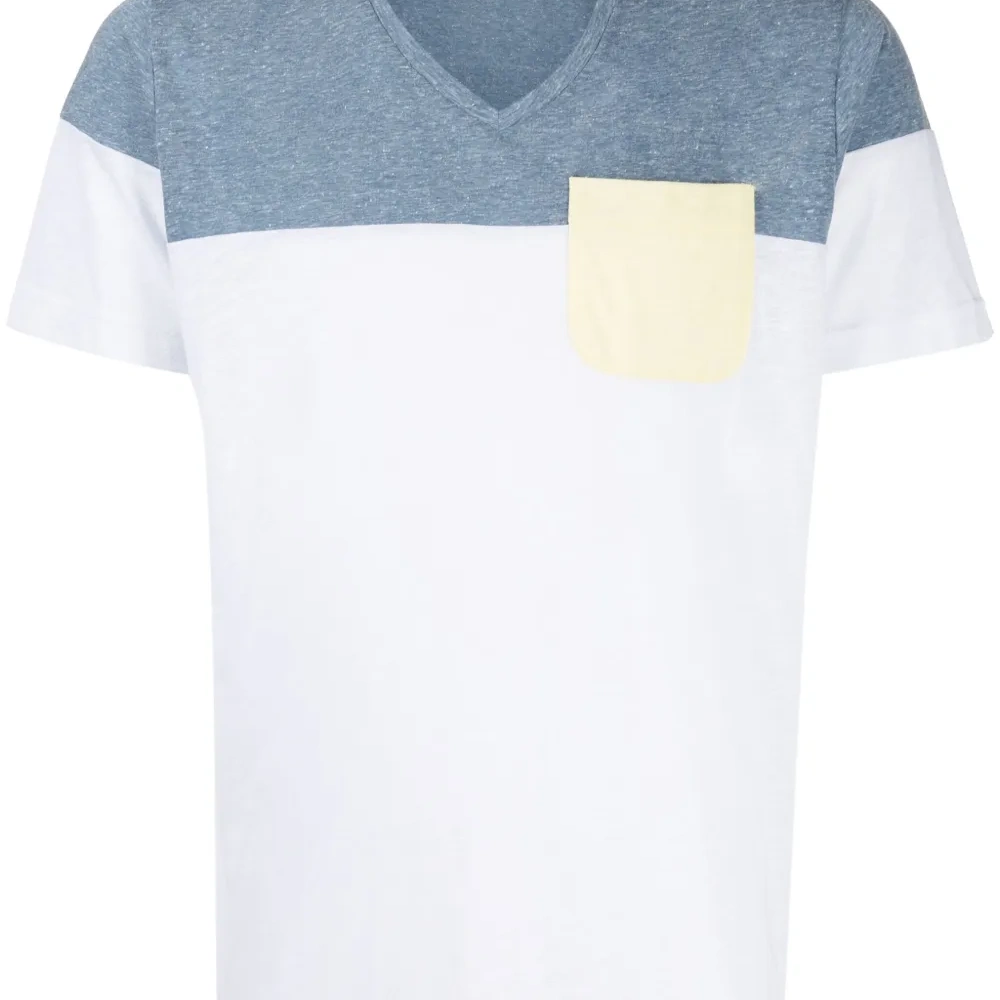 Белый, голубой, смесовый хлопок, ткань джерси, дизайн колор-блок, V-образный вырез, короткие рукава и прямой подол.