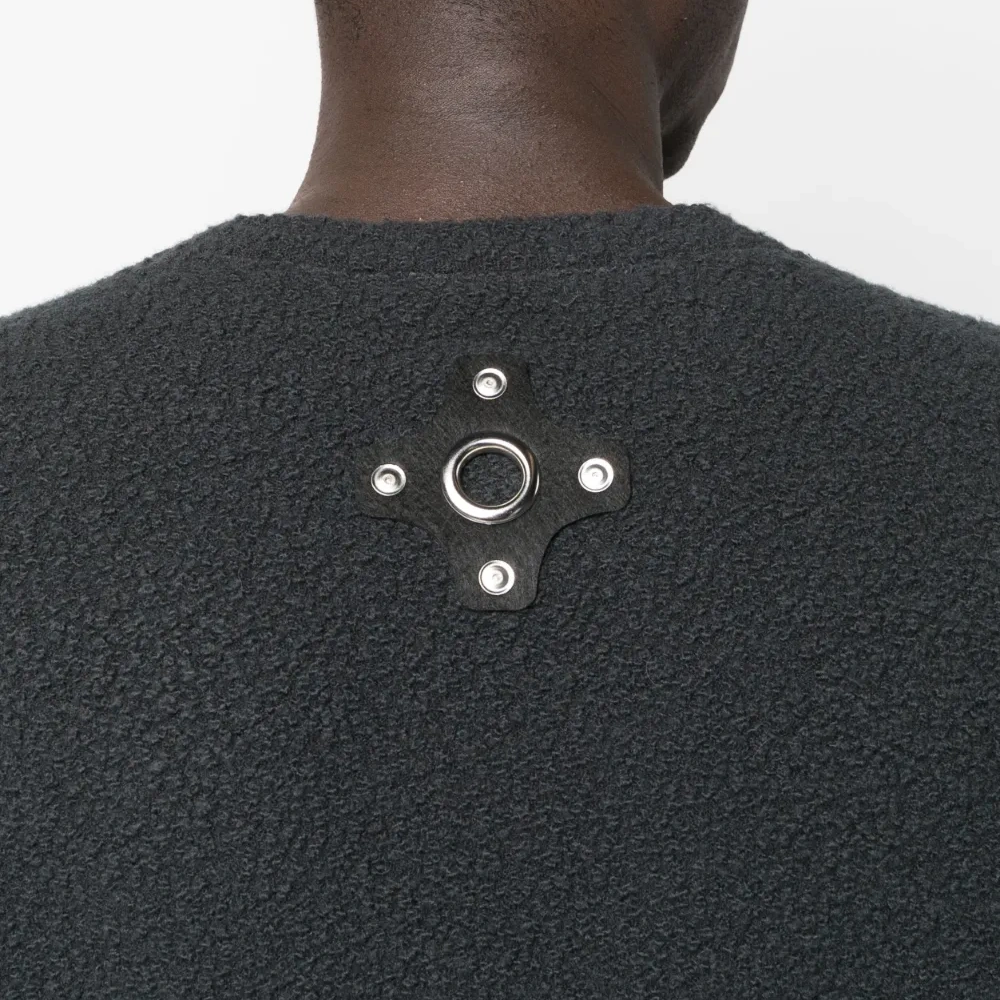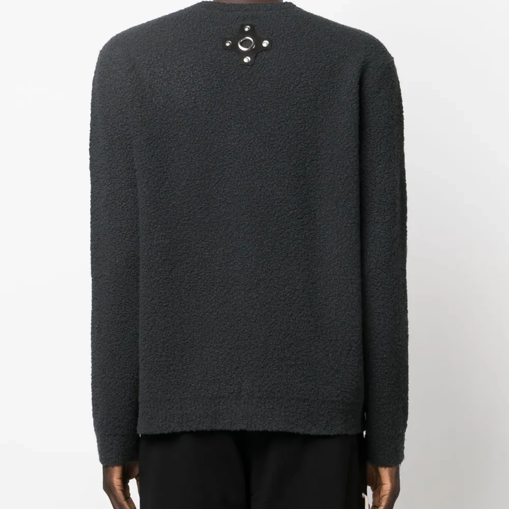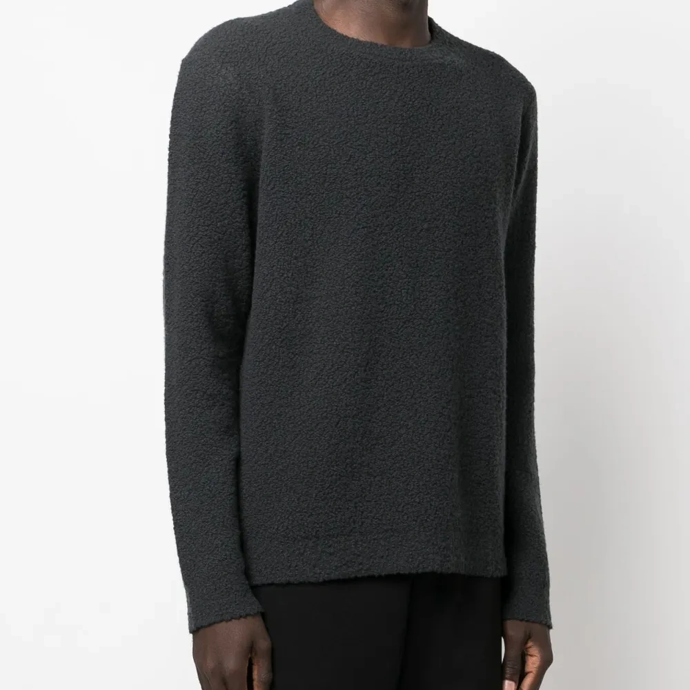 Темно-серый, смесовая шерсть мериноса, трикотажный материал, материал c флисовой текстурой, серебристый металлический логотип, круглый вырез, приспущенные плечи, длинные рукава и прямой подол.