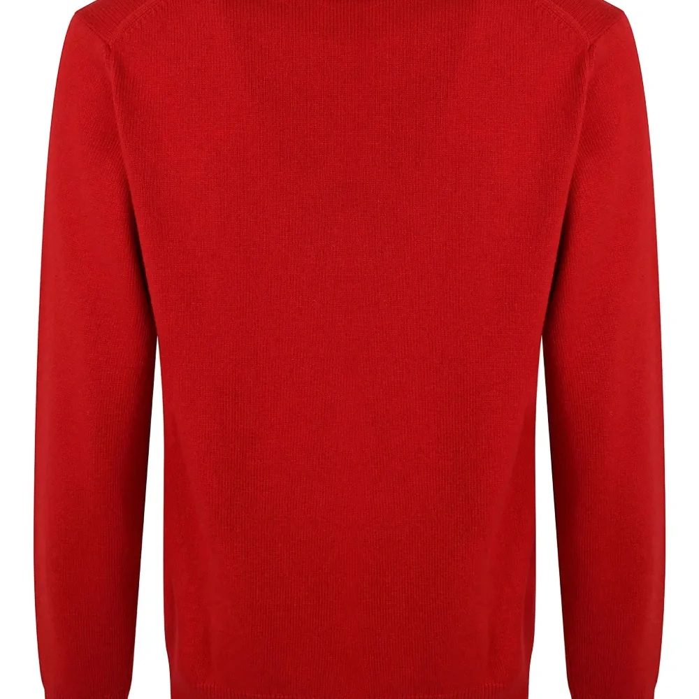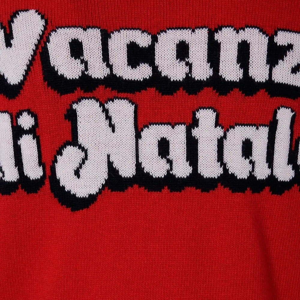 красный шерстяной вязаный джемпер с круглым вырезом, интарсией и аппликацией в виде букв, длинные рукава