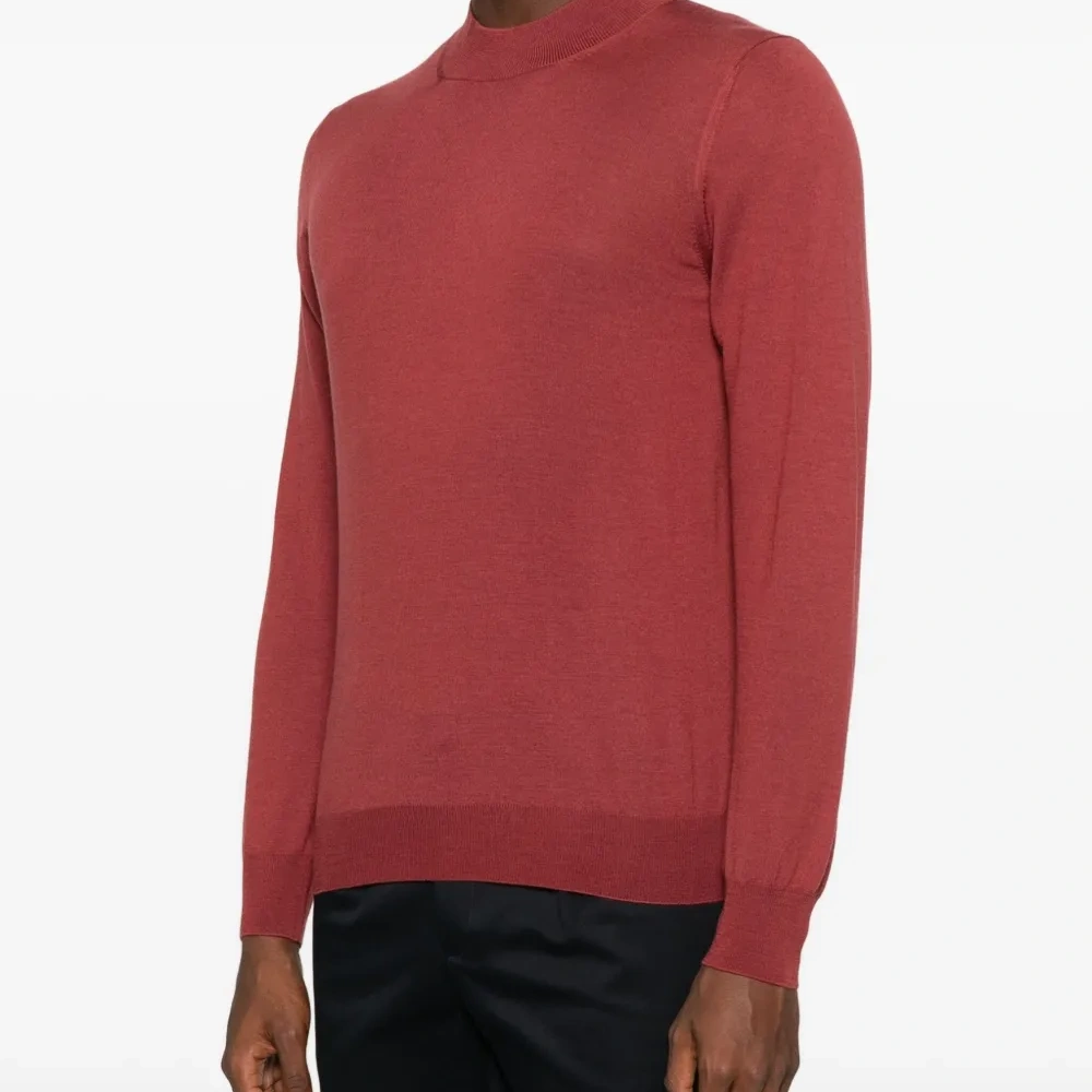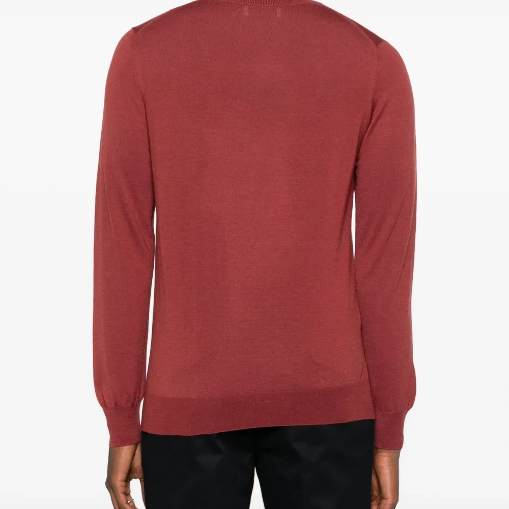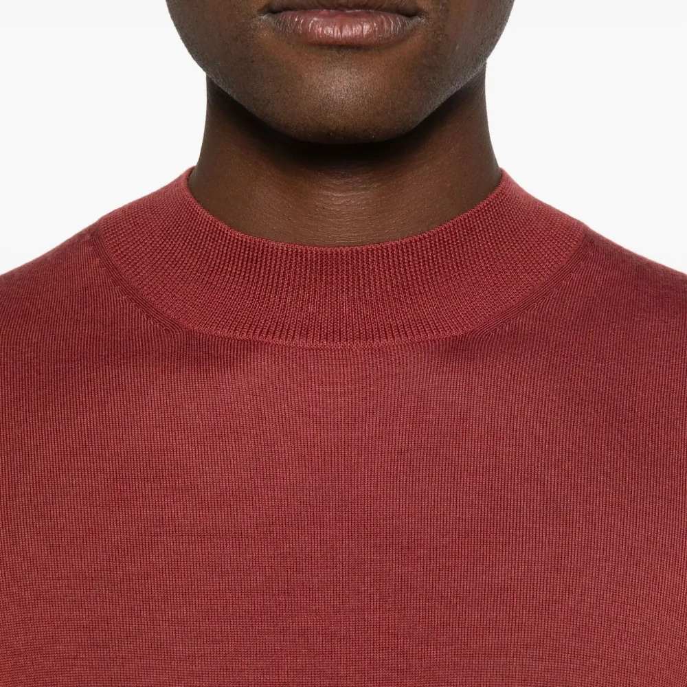 бордовый джемпер с круглым вырезом, длинными рукавами, отделкой-панелью, тонкой вязкой и прямым подолом