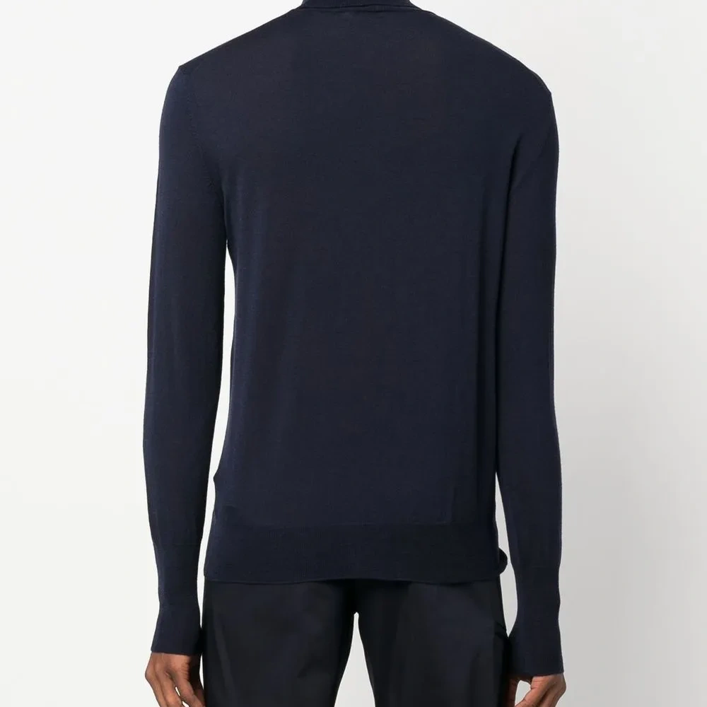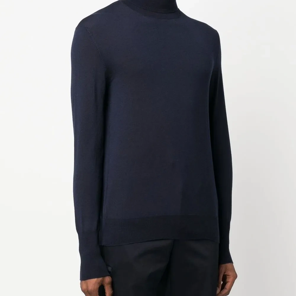 Темно-синий, необработанная шерсть, тонкая вязка, высокий воротник, длинные рукава и подол в рубчик.