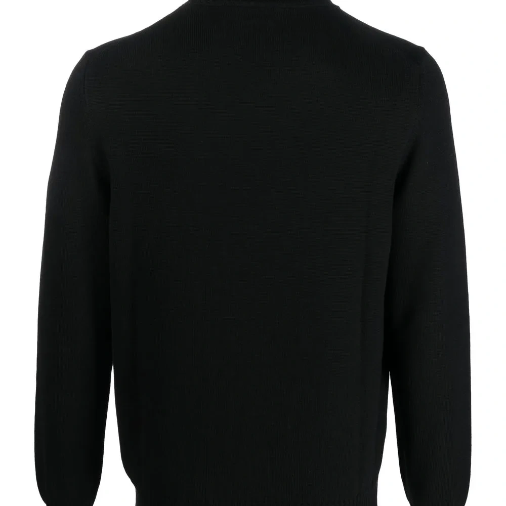 Черный, необработанная шерсть, трикотажный материал, высокий воротник, длинные рукава, прямой подол и вязаные края в рубчик.