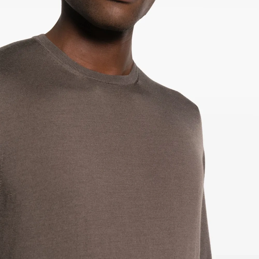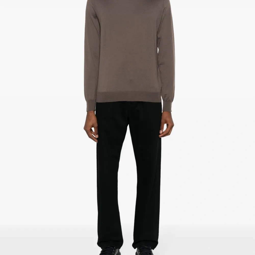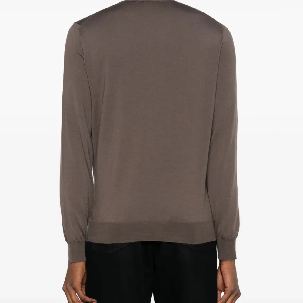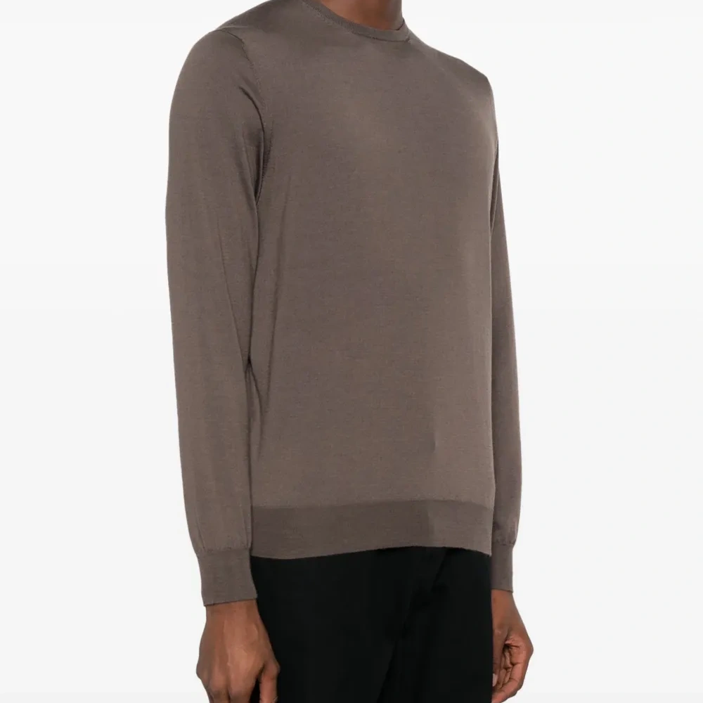 Серо-коричневый, смесовая шерсть мериноса, вязаные края в рубчик, круглый вырез, длинные рукава и прямой подол.