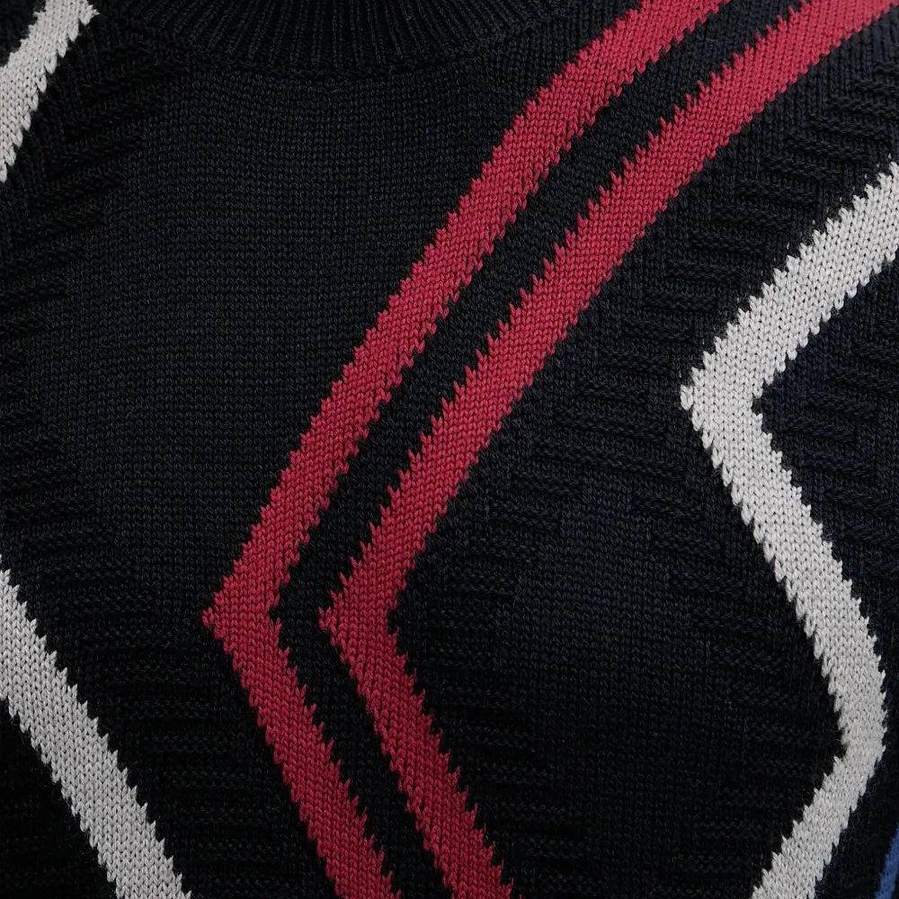темно-синий зигзагообразный узор, длинные рукава, круглый вырез, ребристый край, ребристые манжеты