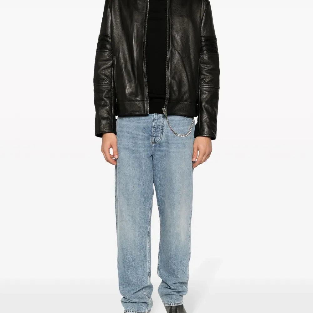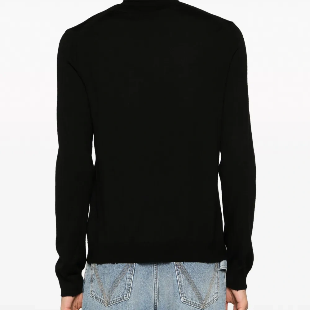 Черный, шерсть мериноса, ткань в мелкий рубчик, необработанные края, высокий воротник, длинные рукава и прямой подол. Это унисекс-модель. Обратите внимание, что для нее используется мужская размерная сетка.