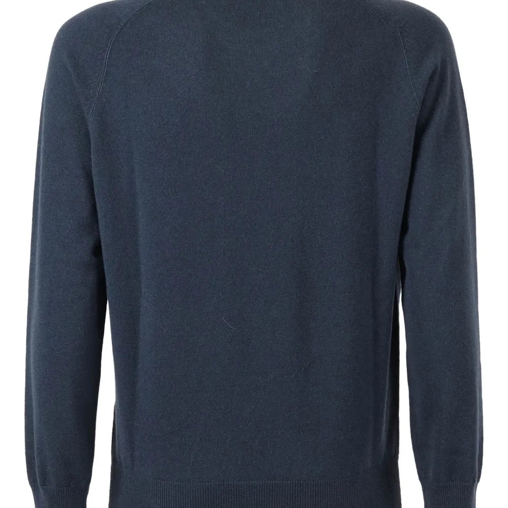 темно-синий свитер с круглым вырезом, треугольной отделкой, длинными рукавами, ребристыми манжетами и ребристым подолом