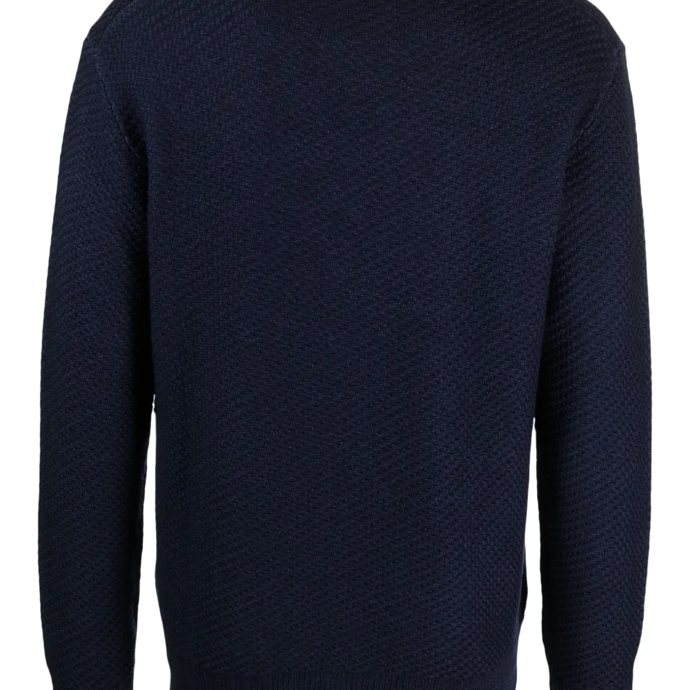 Темно-синий, необработанная шерсть, трикотажный материал, круглый вырез и длинные рукава.
