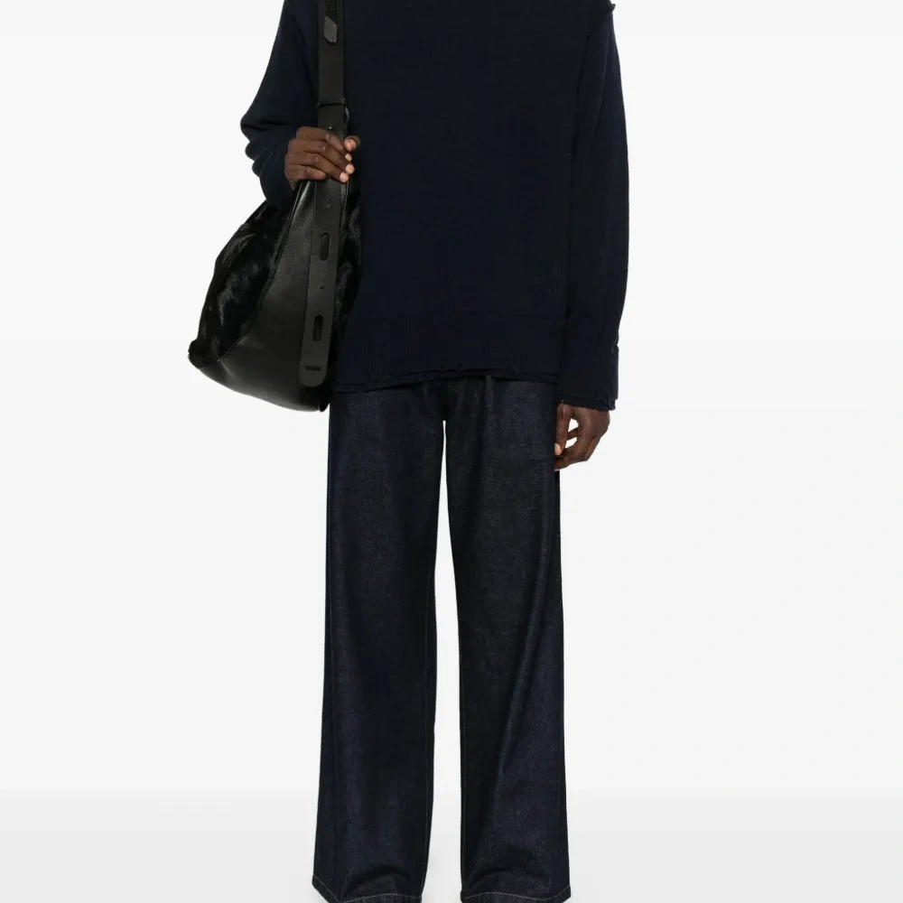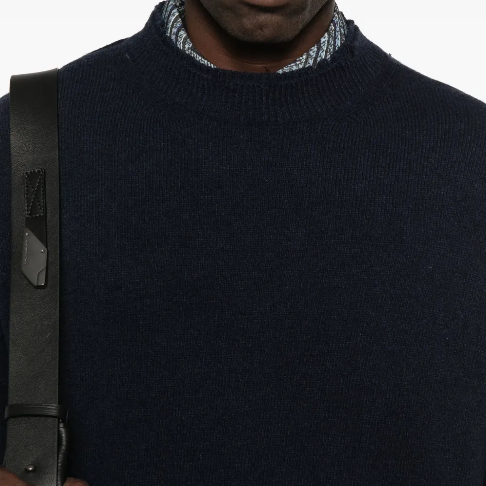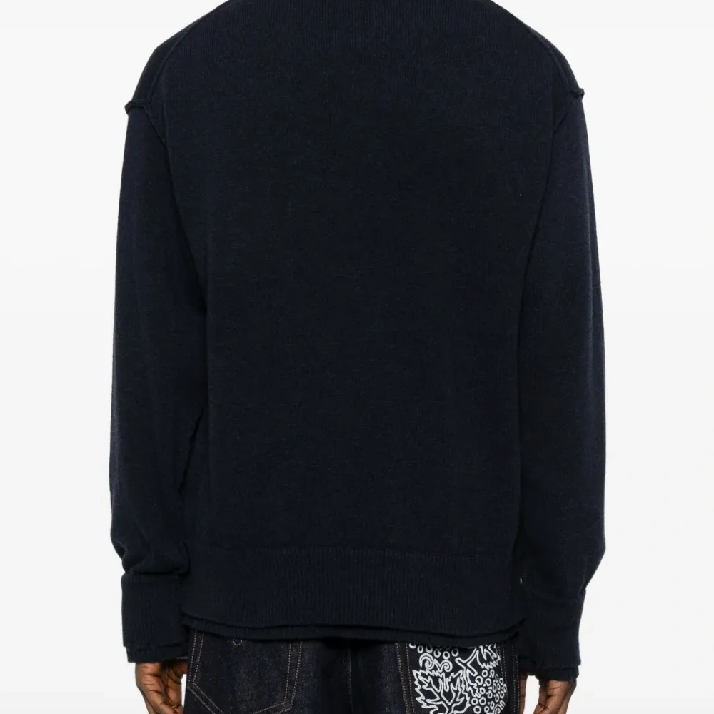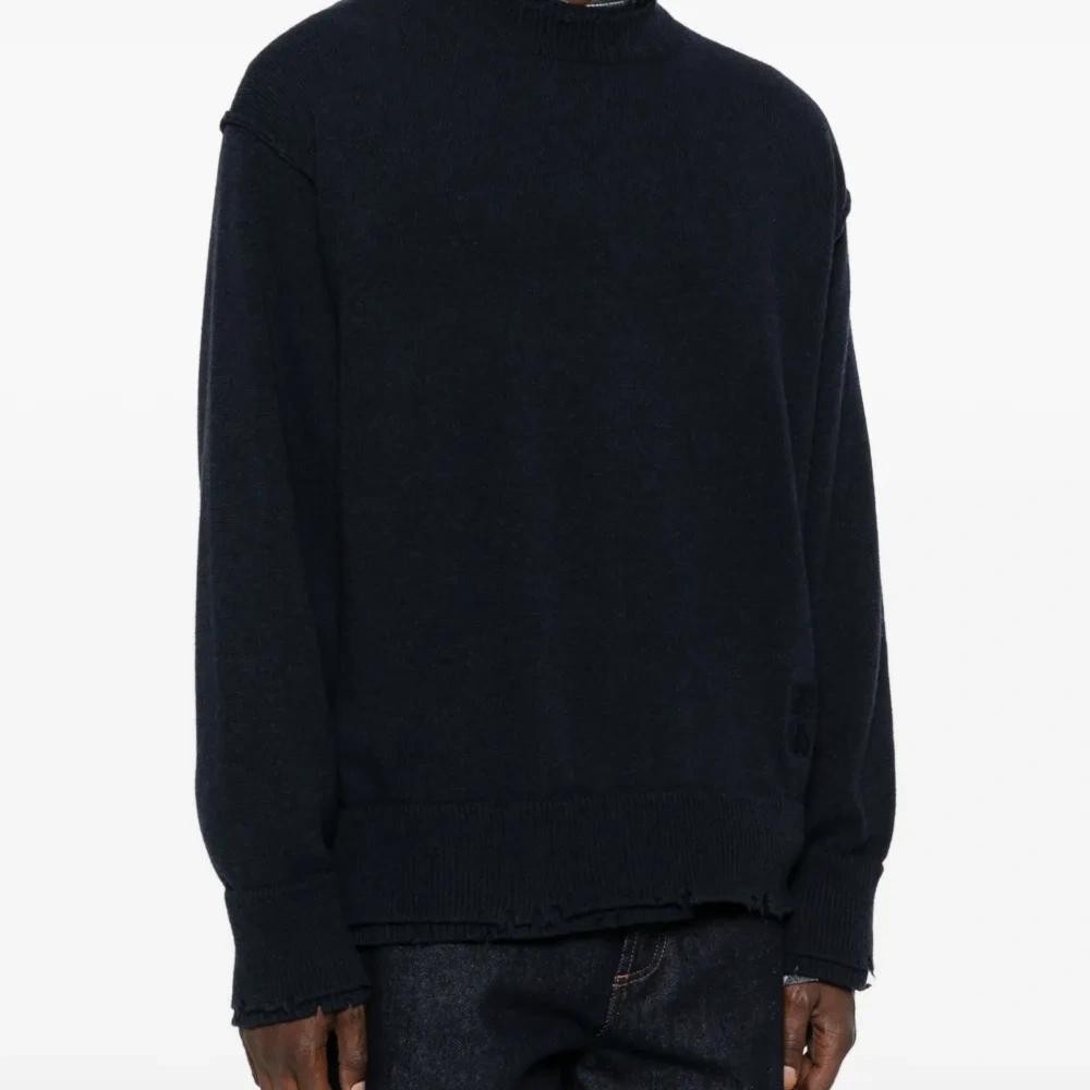 тёмно-синий цвет, круглый вырез, необработанный край, длинные рукава, необработанные манжеты, вышитая отделка