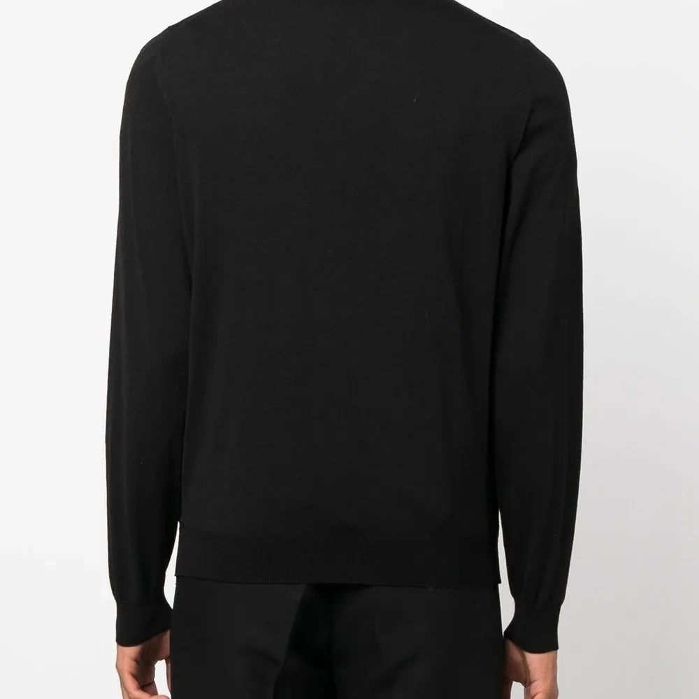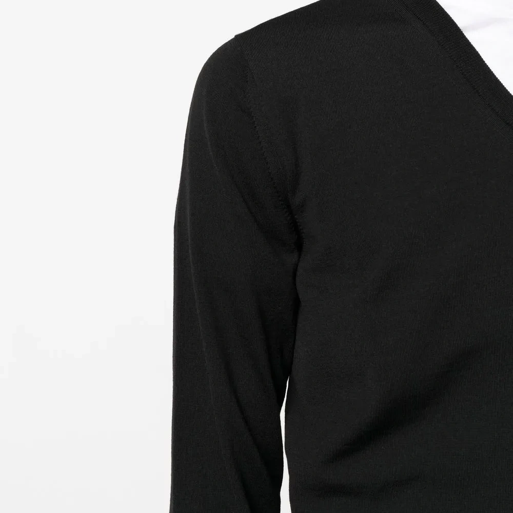 Черный, смесовая необработанная шерсть, детали в рубчик, V-образный вырез, длинные рукава и прямой подол.