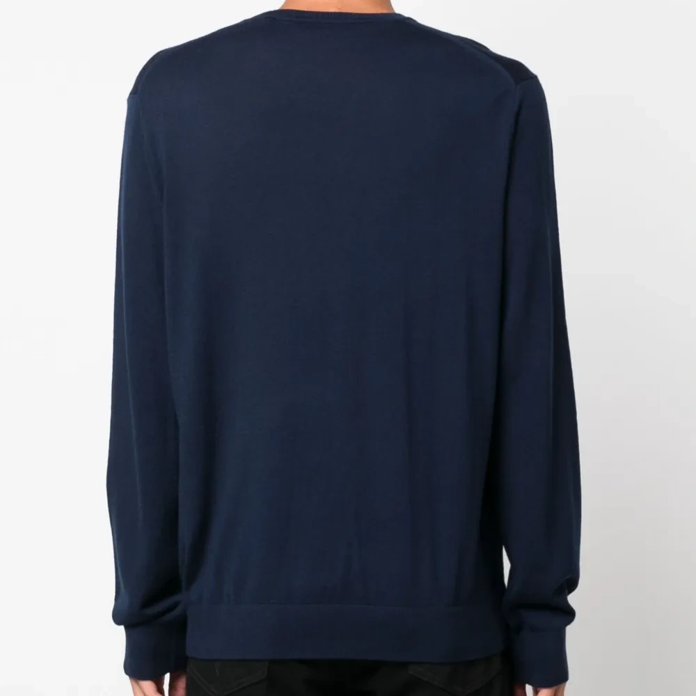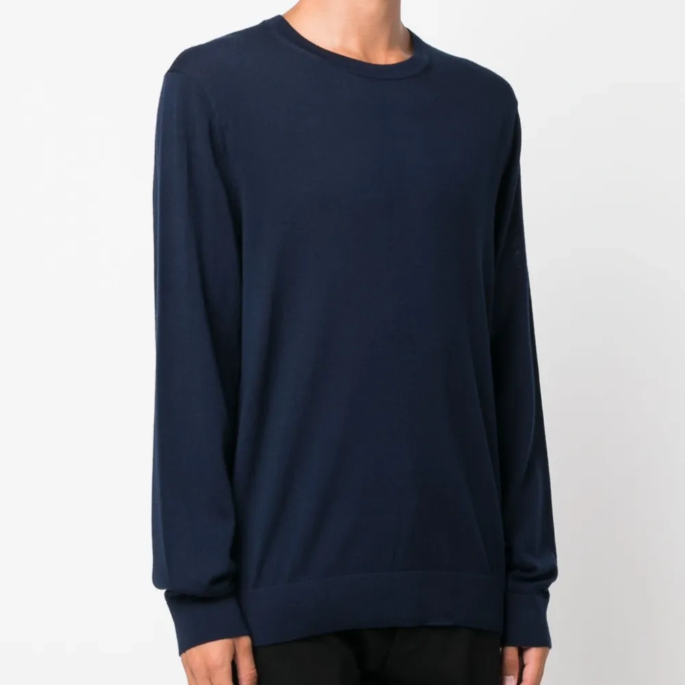 Темно-синий, шерсть мериноса, тонкая вязка, круглый вырез, длинные рукава и прямой подол.