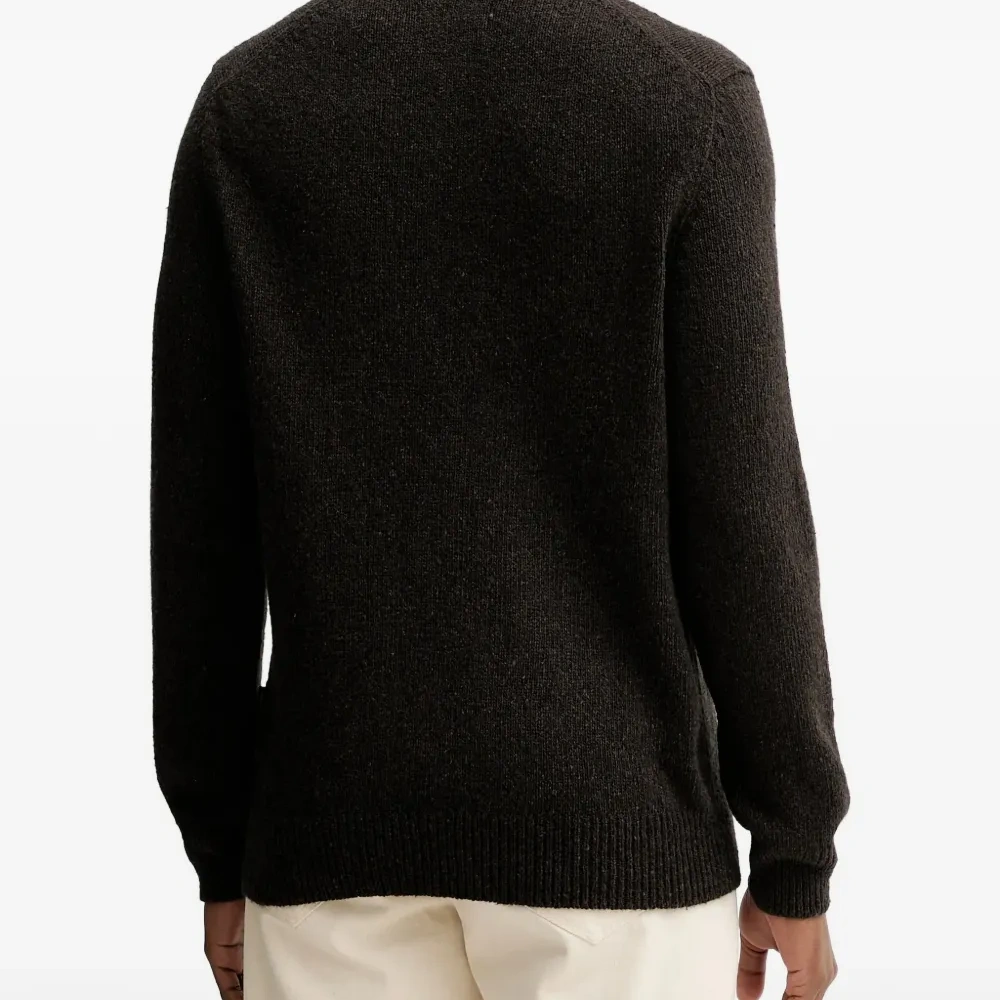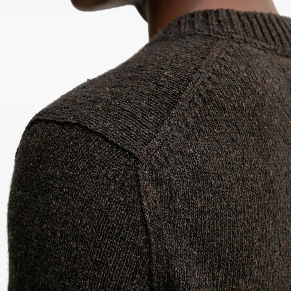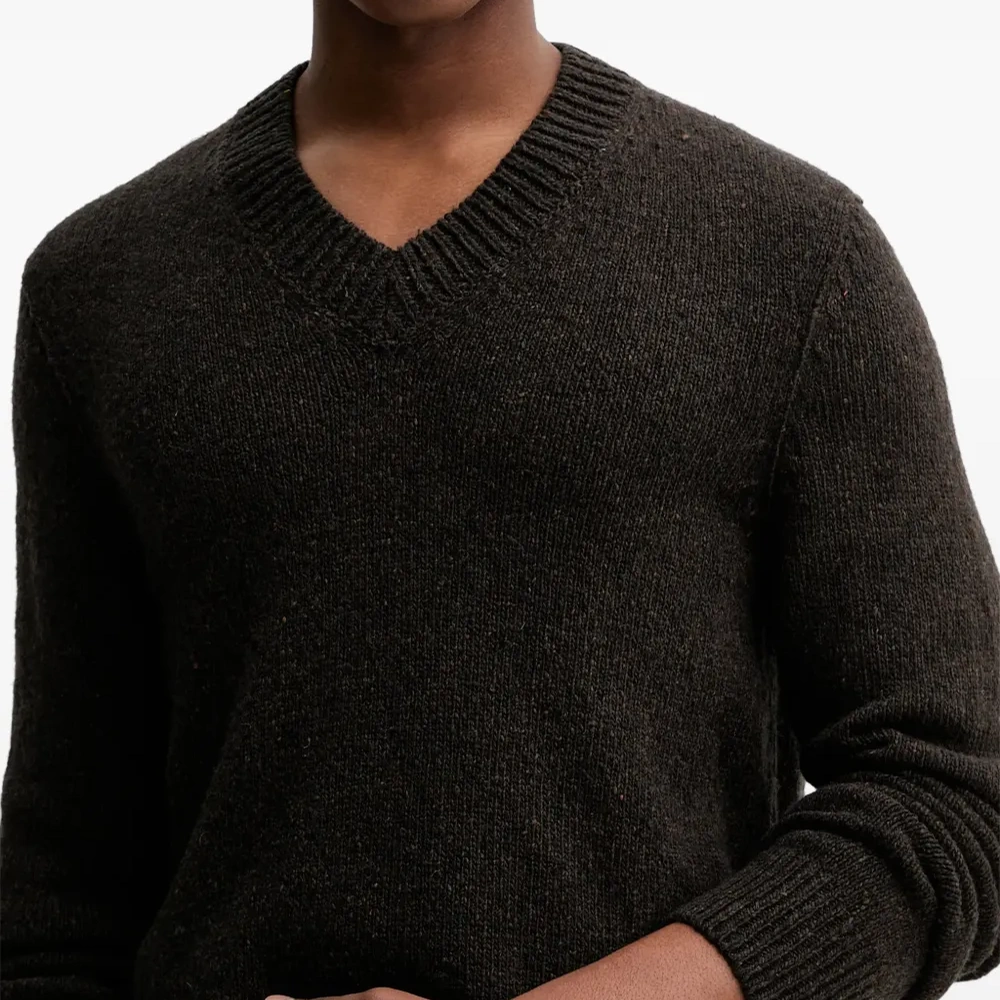 коричневый свитер с V-образным вырезом, длинными рукавами, вязаной фактурой, плечевой вставкой и ребристым низом