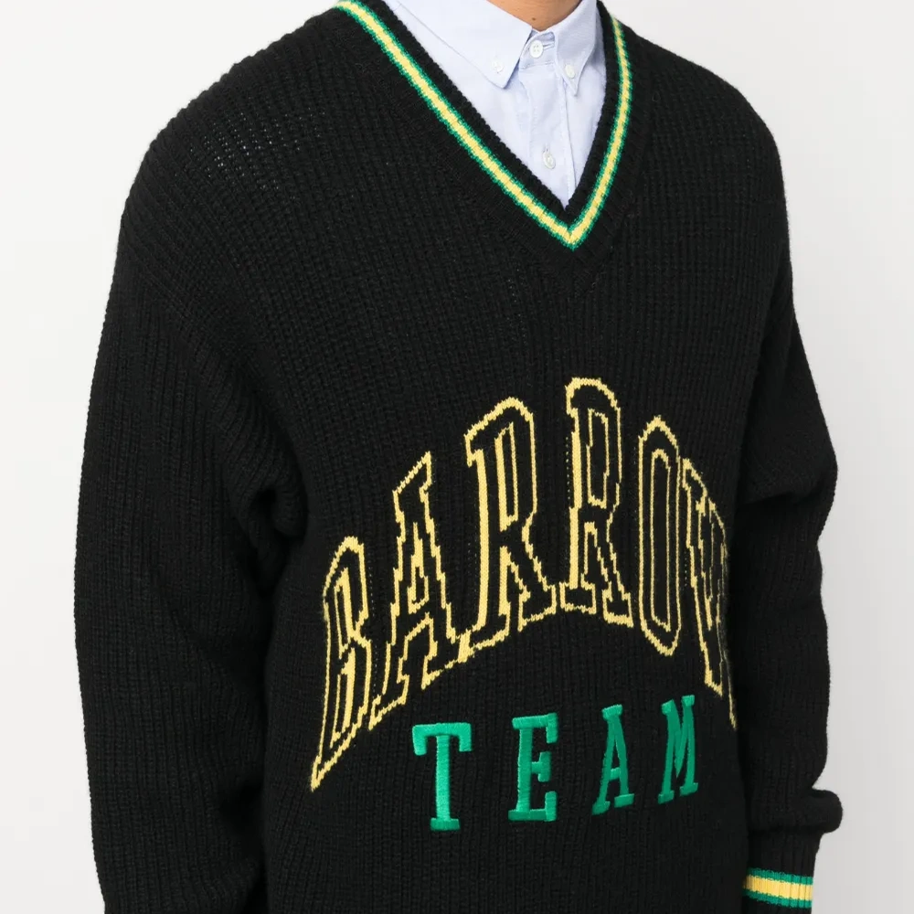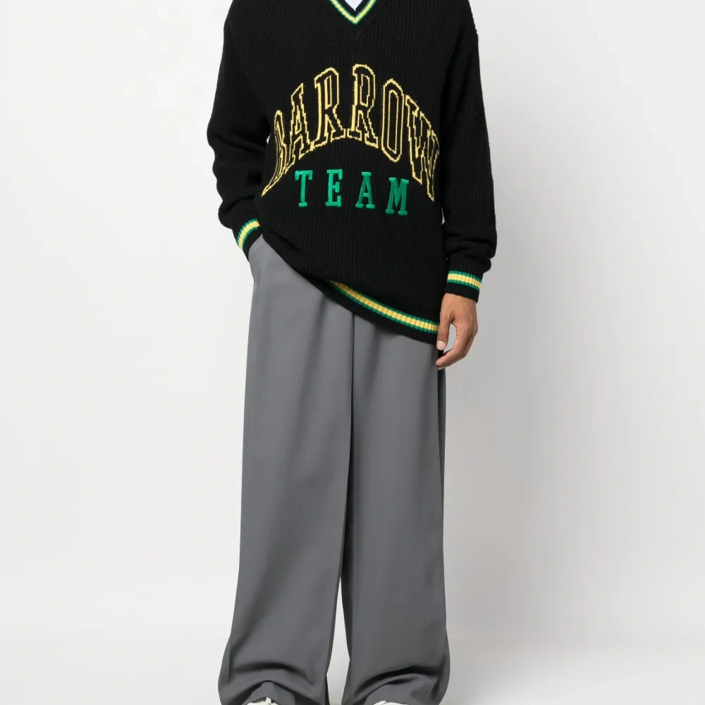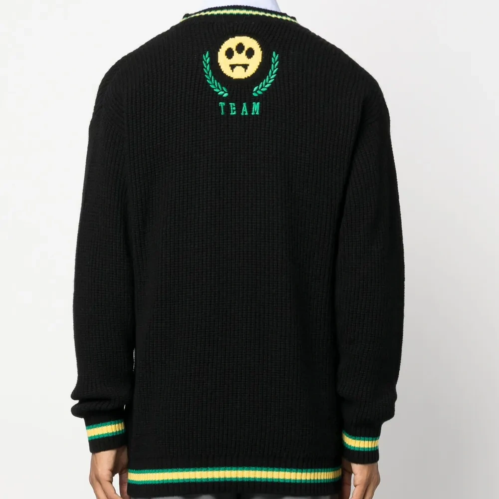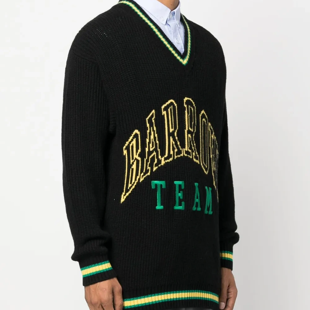 Черный, вязка в технике интарсия, логотип в технике интарсия, вышитая надпись, длинные рукава и прямой подол.