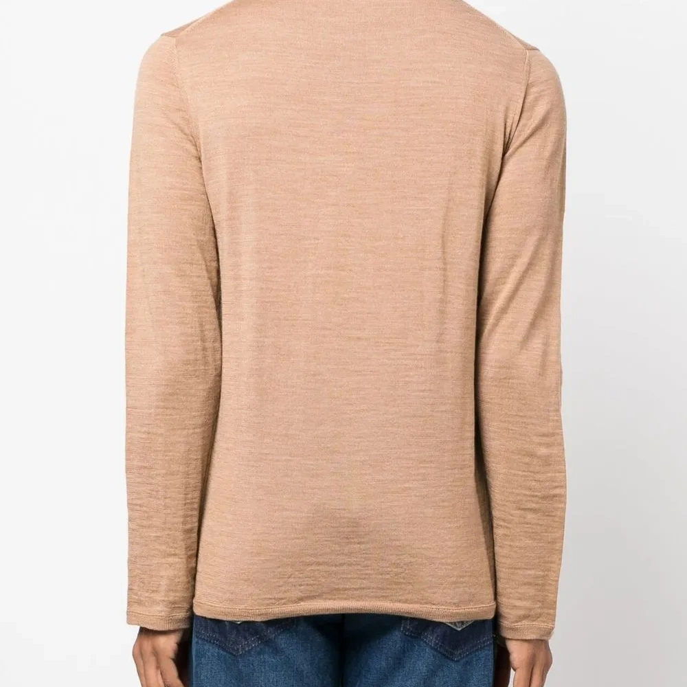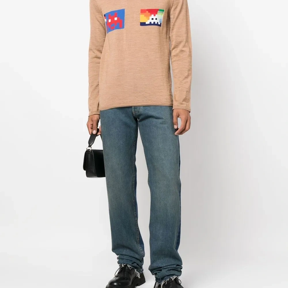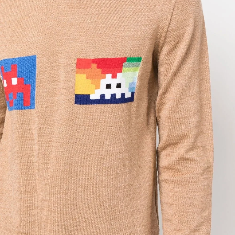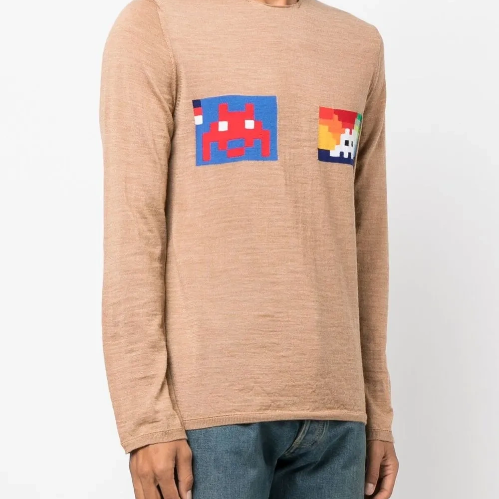 Песочно-бежевый, смесовая шерсть, графичный принт спереди, круглый вырез, длинные рукава и прямой подол.