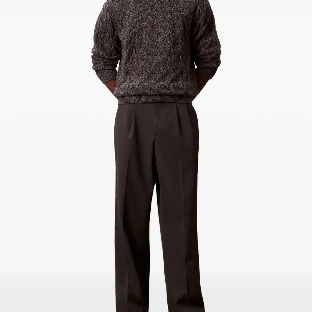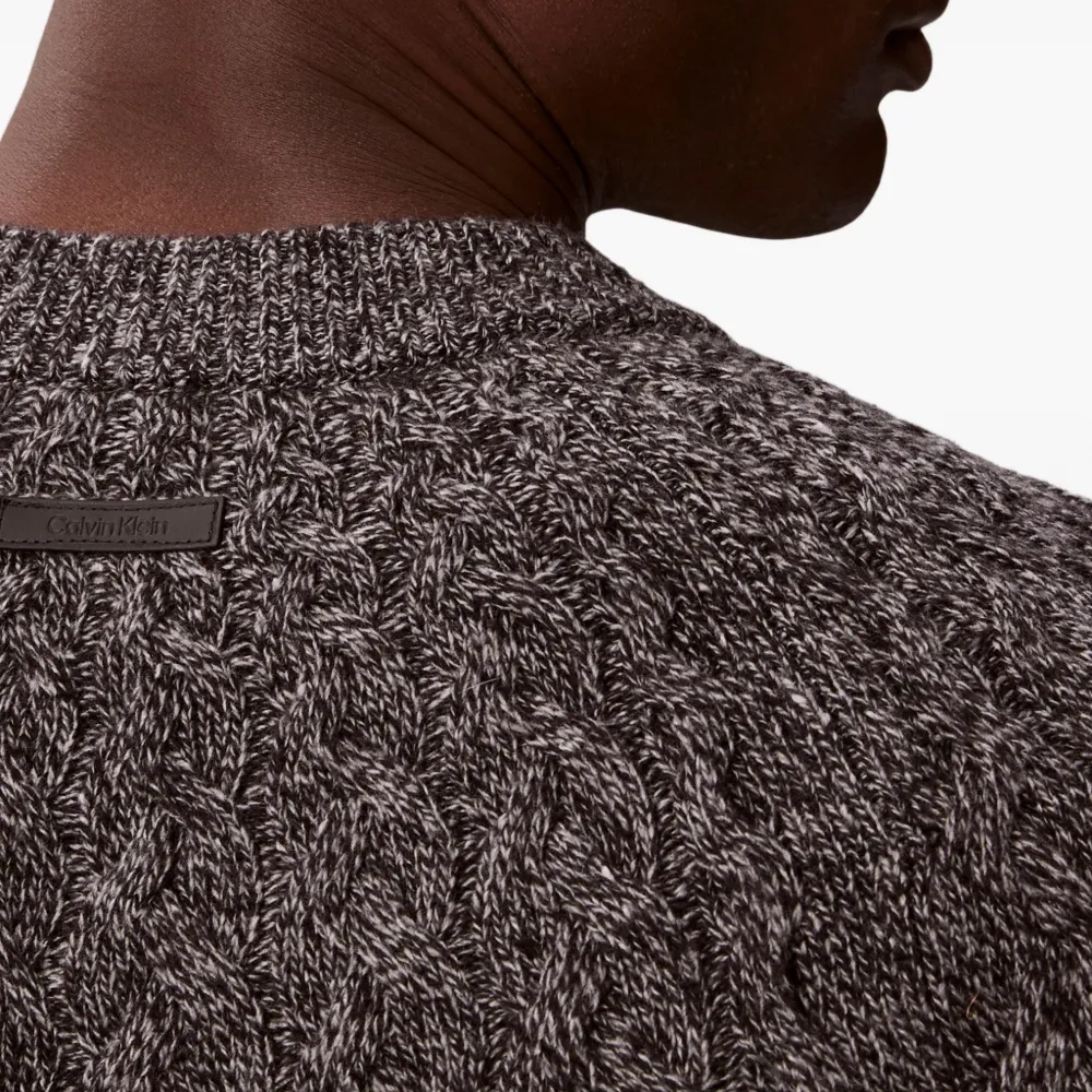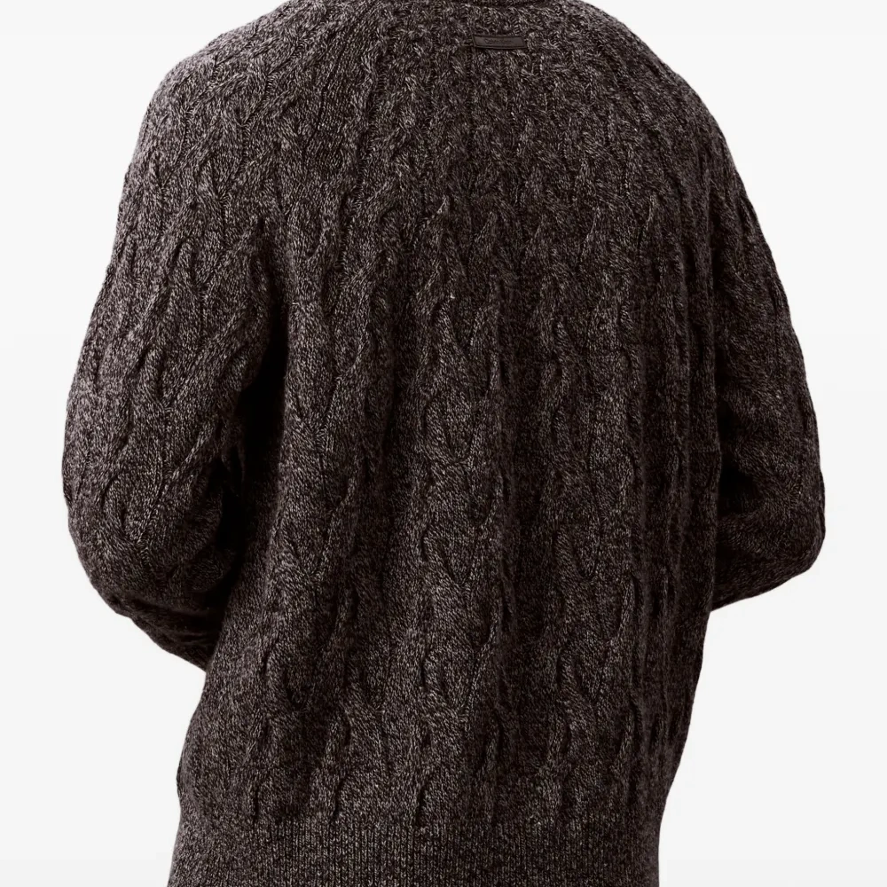 темно-коричневый свитер с круглым вырезом, вязаным узором "косы", длинными рукавами, ребристым низом и манжетами