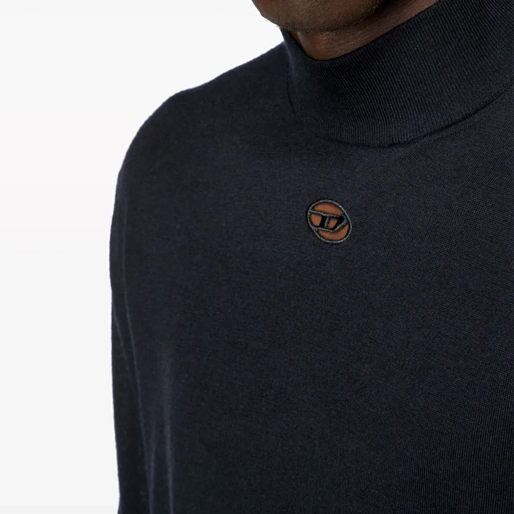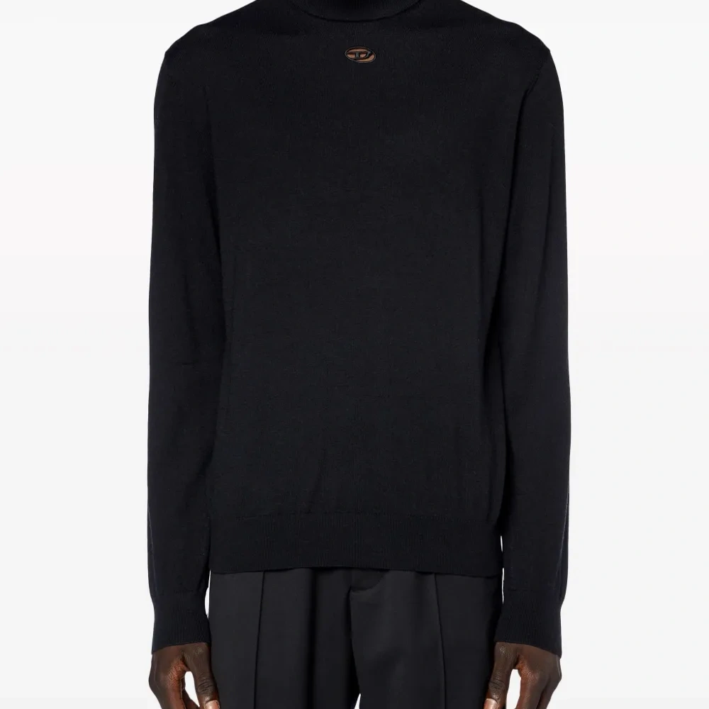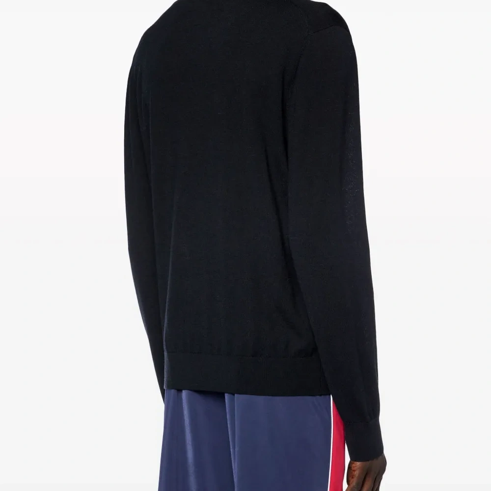 Черный, шерсть, тонкая вязка, вышитый логотип спереди, высокий воротник и длинные рукава.