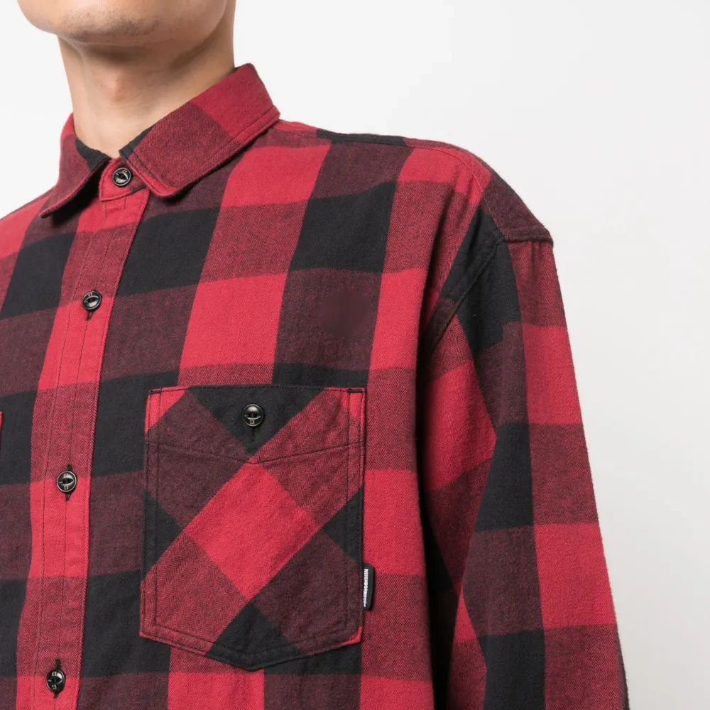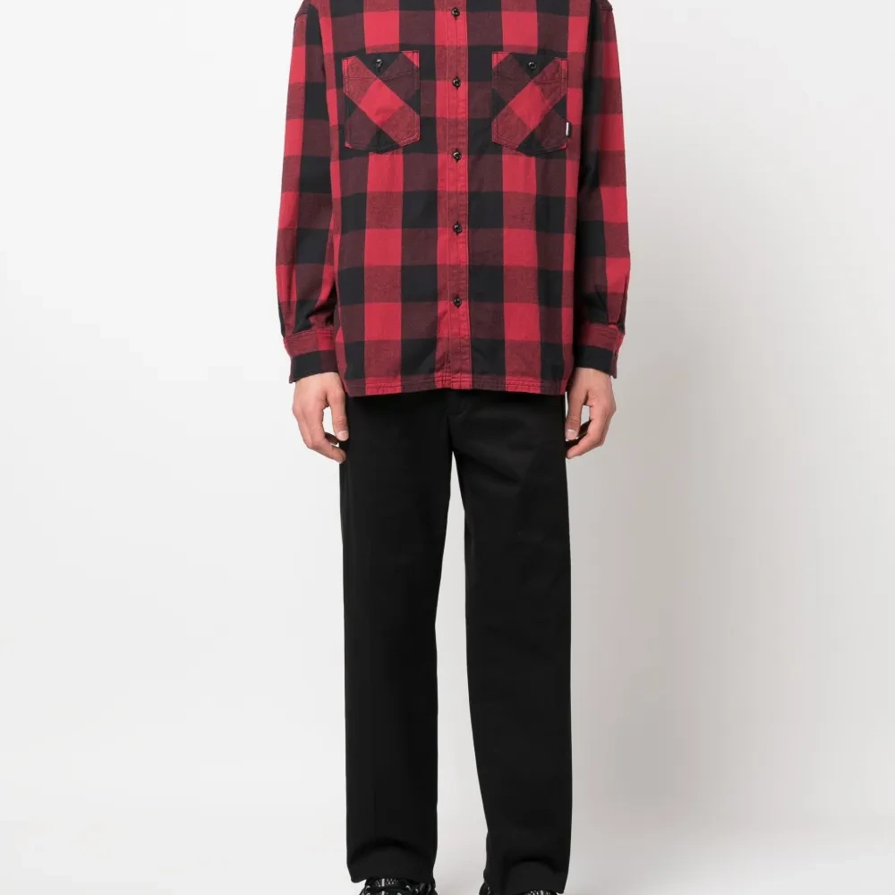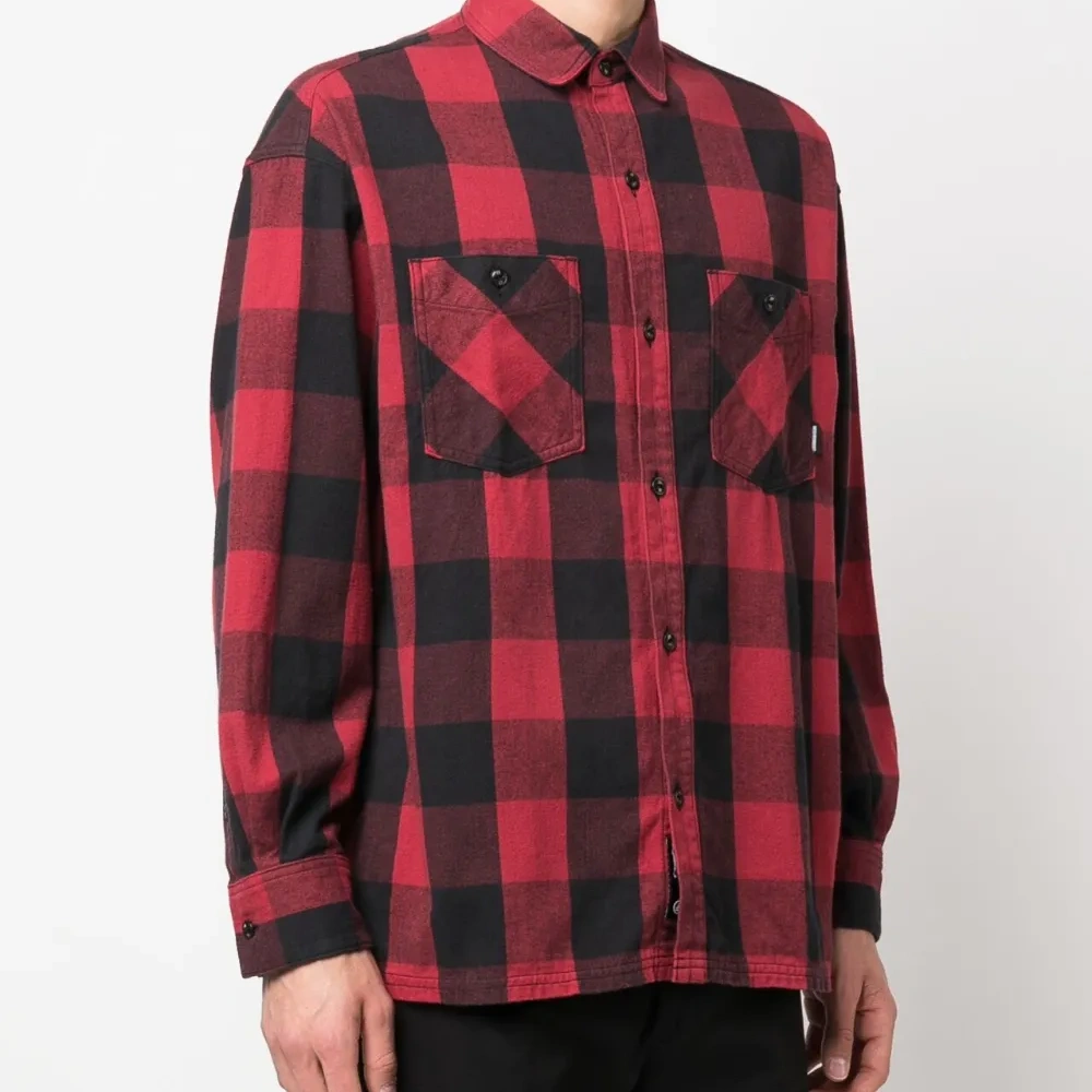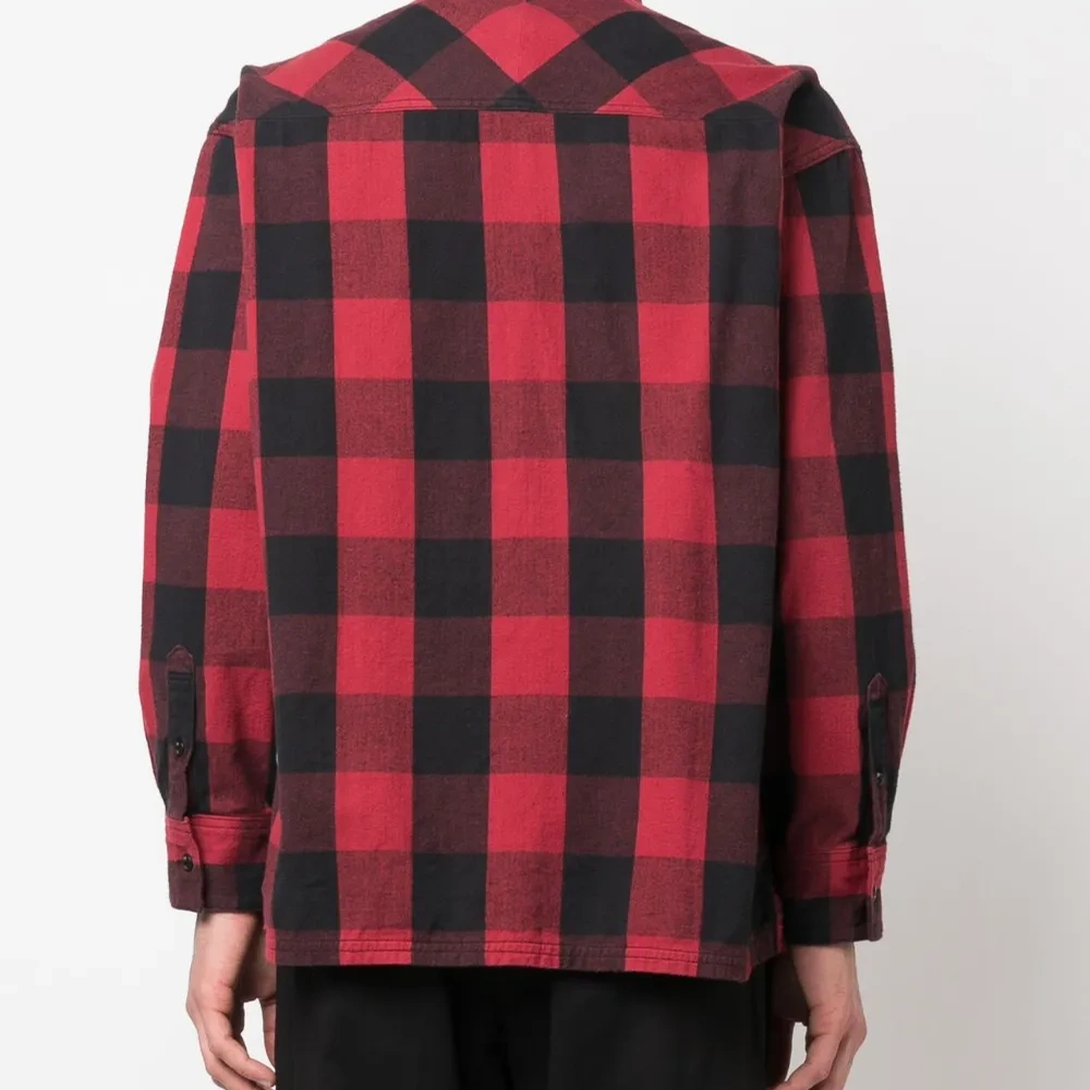 Черный/красный, хлопок, клетчатый узор, отложной воротник, застежка на пуговицах спереди, два накладных кармана спереди, длинные рукава, манжеты на пуговицах и прямой подол.