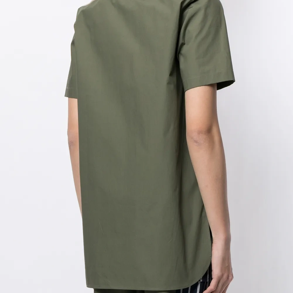 Принт в вертикальную полоску, принт с надписью спереди, планка на пуговицах спереди, классический воротник, короткие рукава и неравномерный подол. Это унисекс-модель. Обратите внимание, что для нее используется мужская размерная сетка.