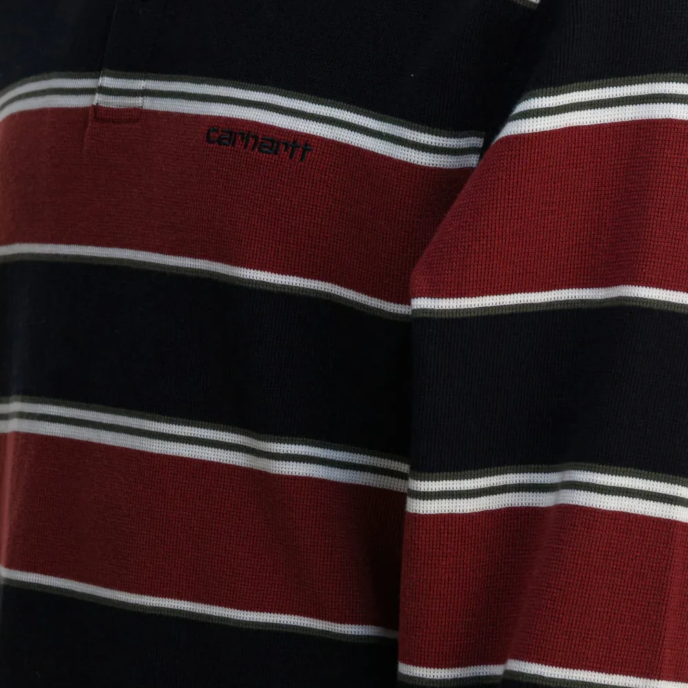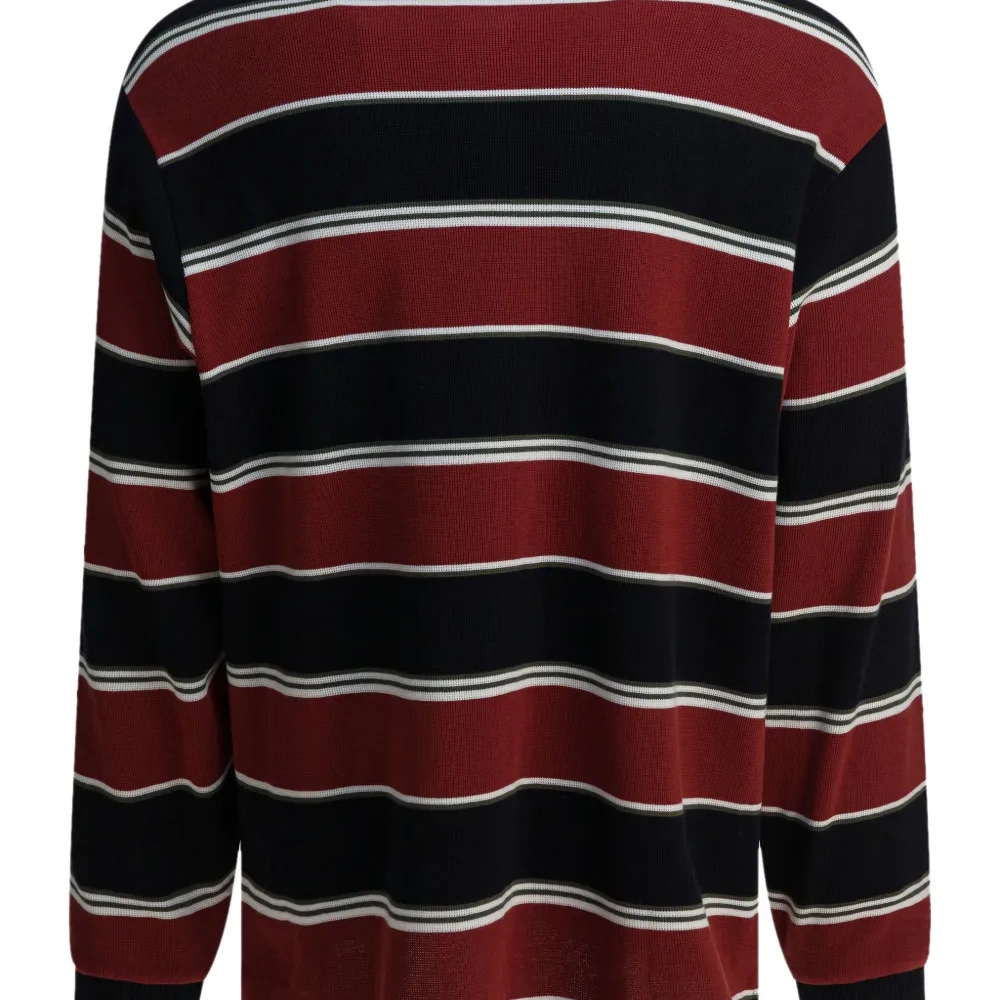 красная полосатая расцветка, вышитый логотип, длинные рукава, ребристые манжеты, застежка на пуговицы