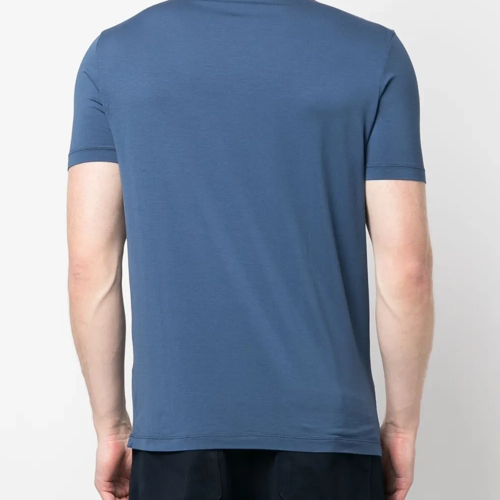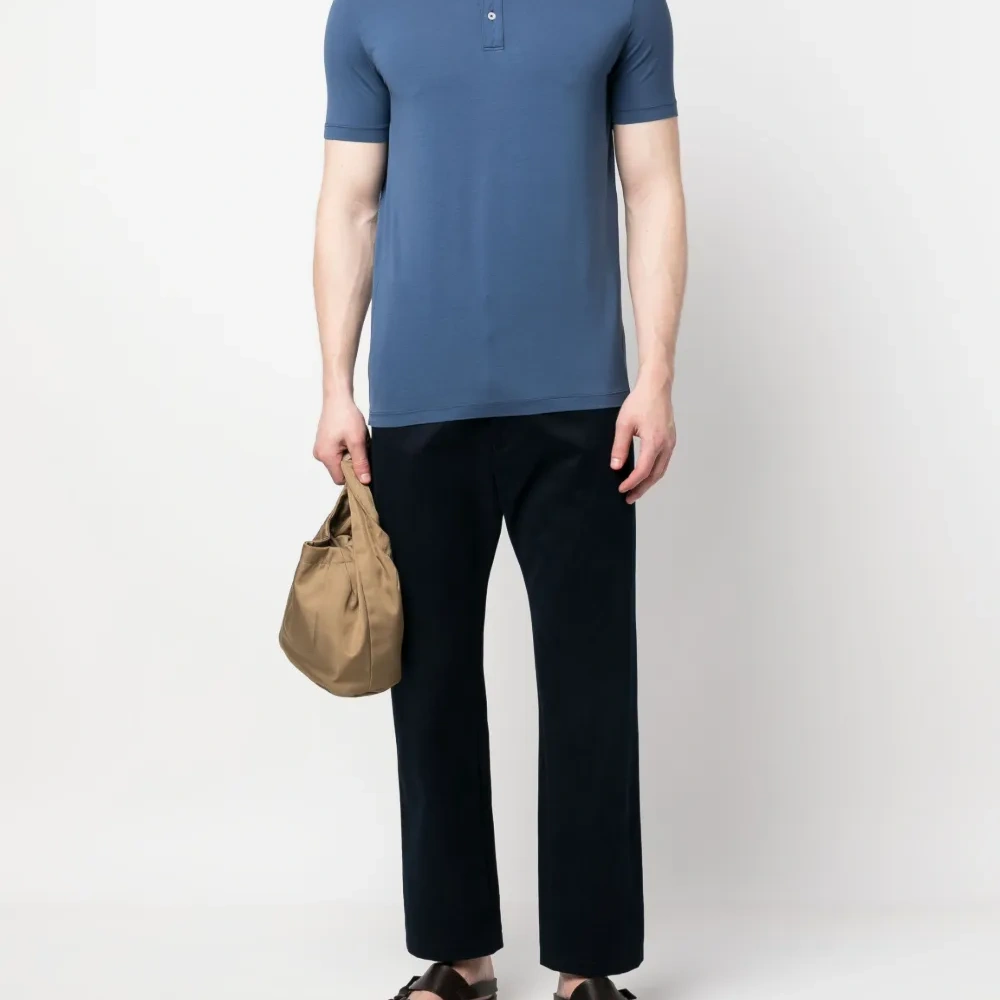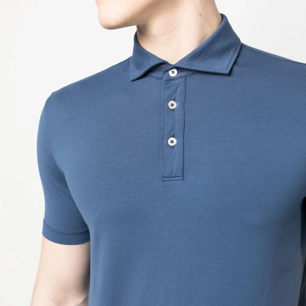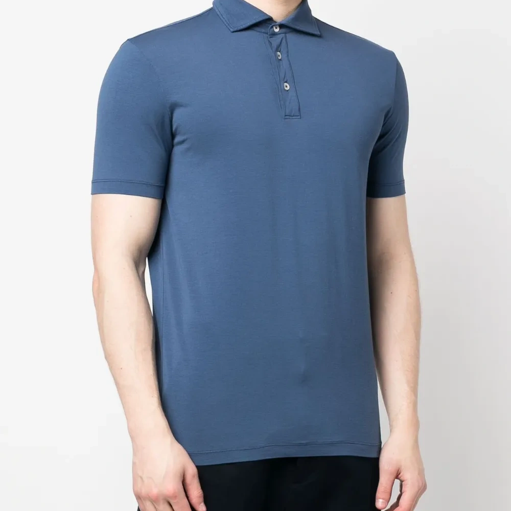 Темно-синий, эластичный хлопок, воротник поло, планка на пуговицах спереди, короткие рукава и прямой подол.