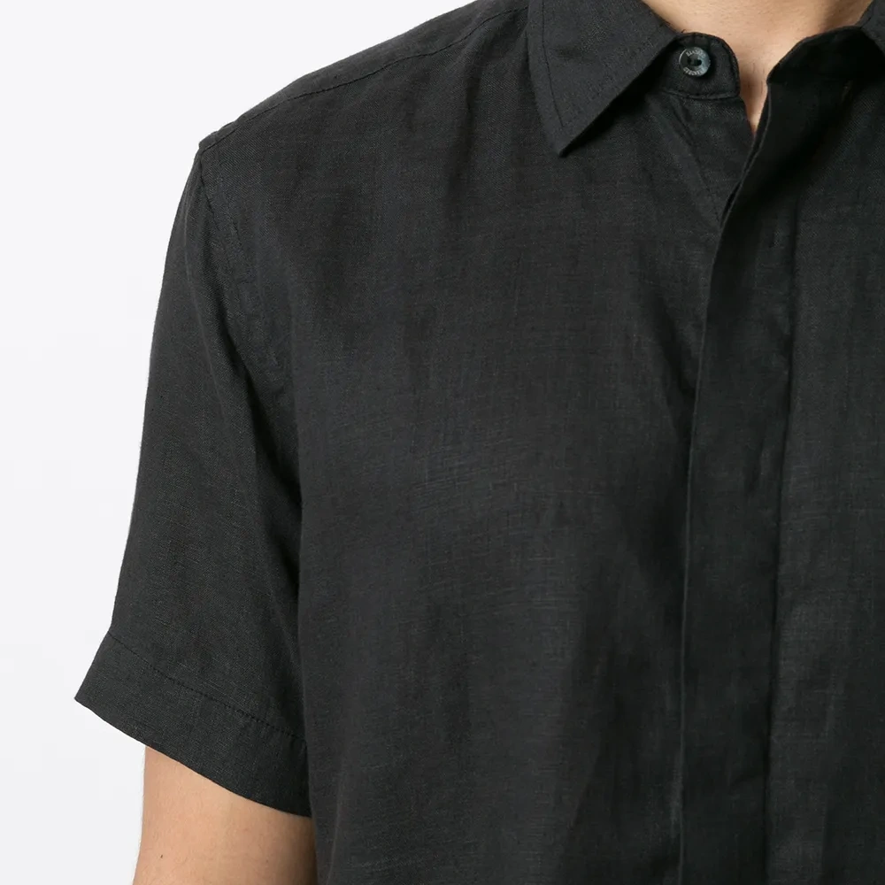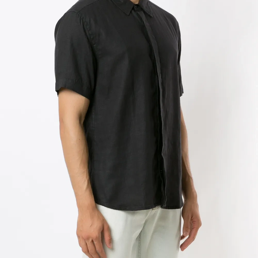 Классический воротник, застежка на пуговицах спереди, короткие рукава и закругленный подол. Цвет: черный.