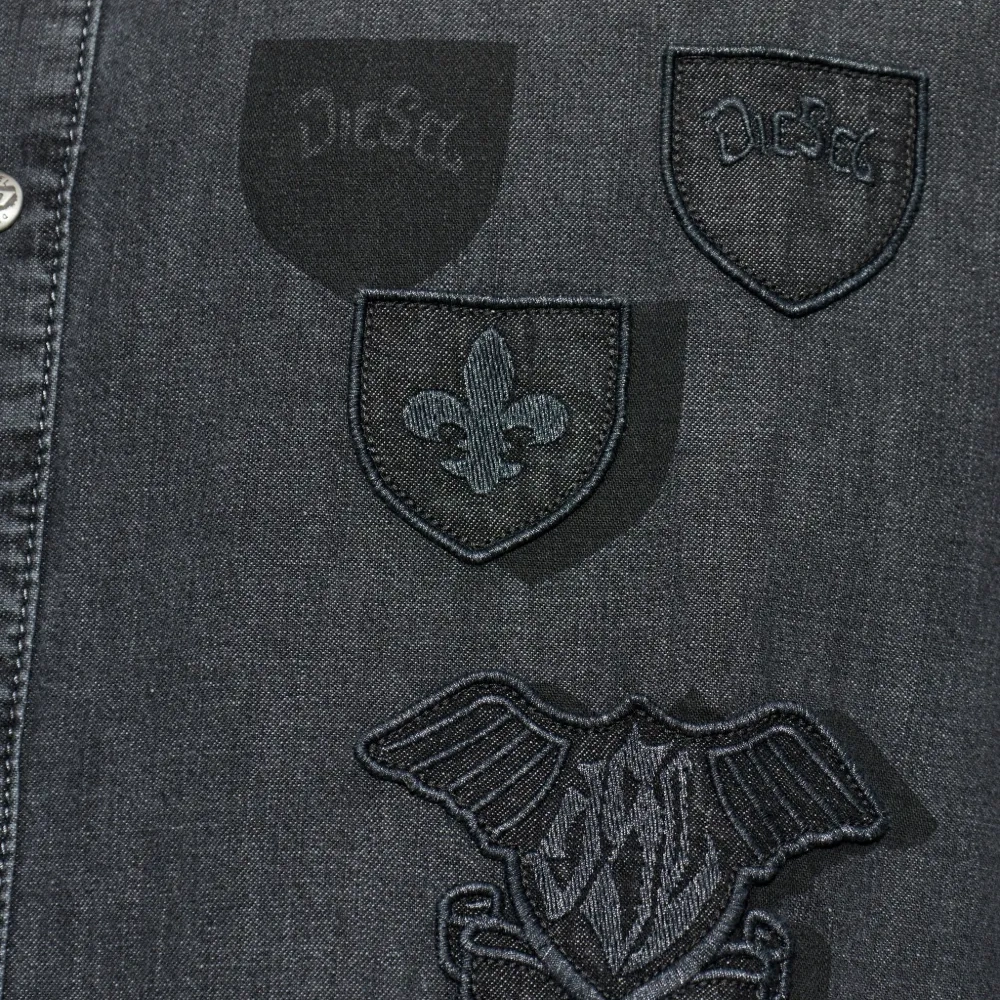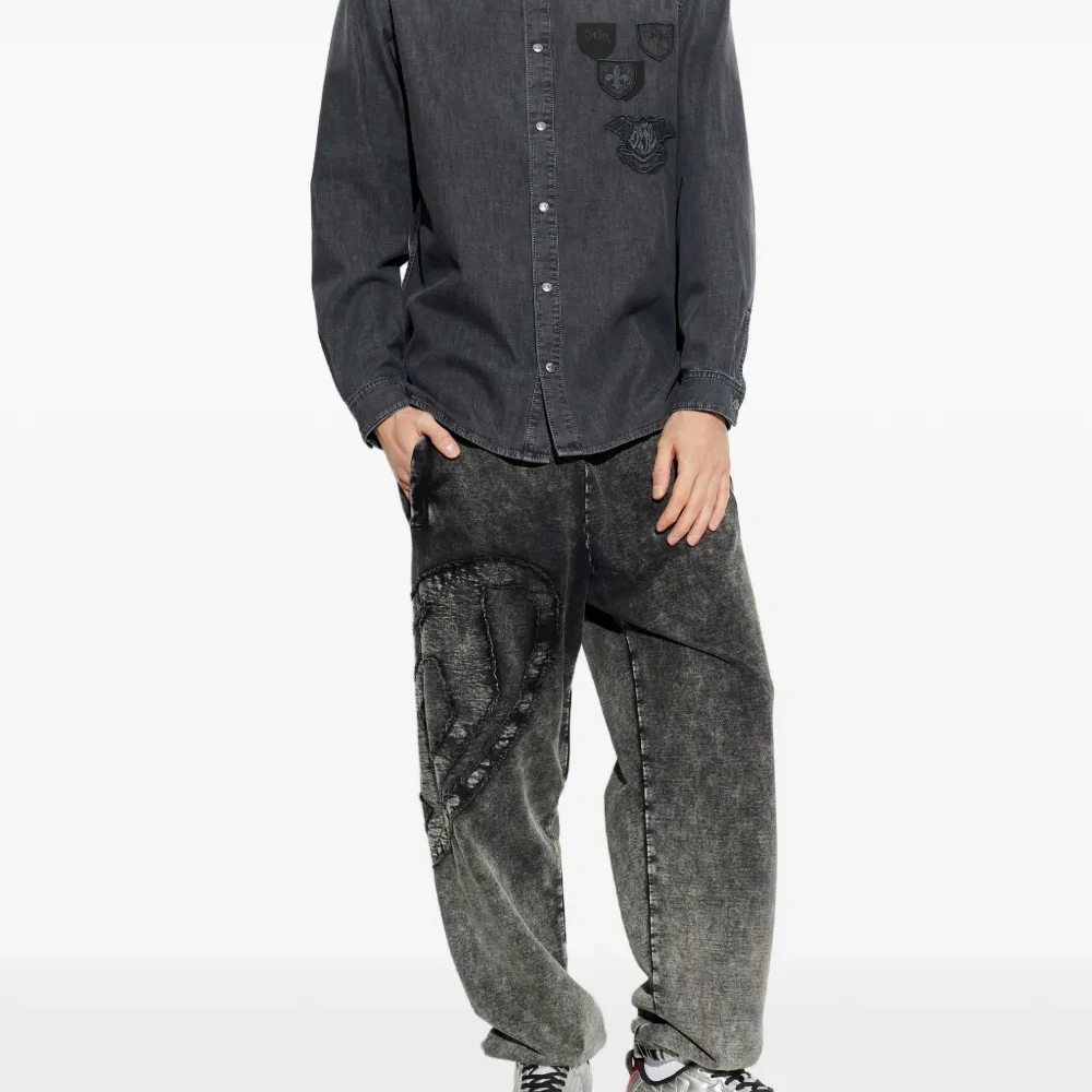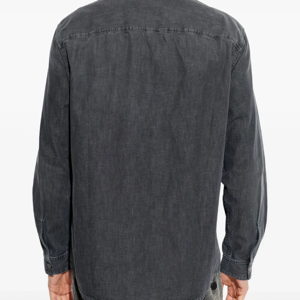 серый цвет, стоячий воротник с отложным краем, застежка на пуговицы, длинные рукава, манжеты на пуговицах