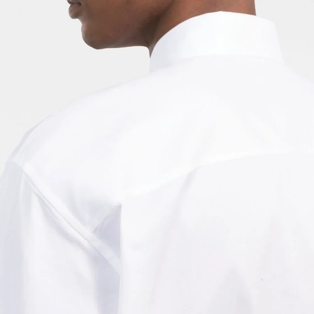 Белый, смесовый хлопок, логотип спереди, классический воротник, застежка на пуговицах спереди, длинные рукава и закругленный подол.