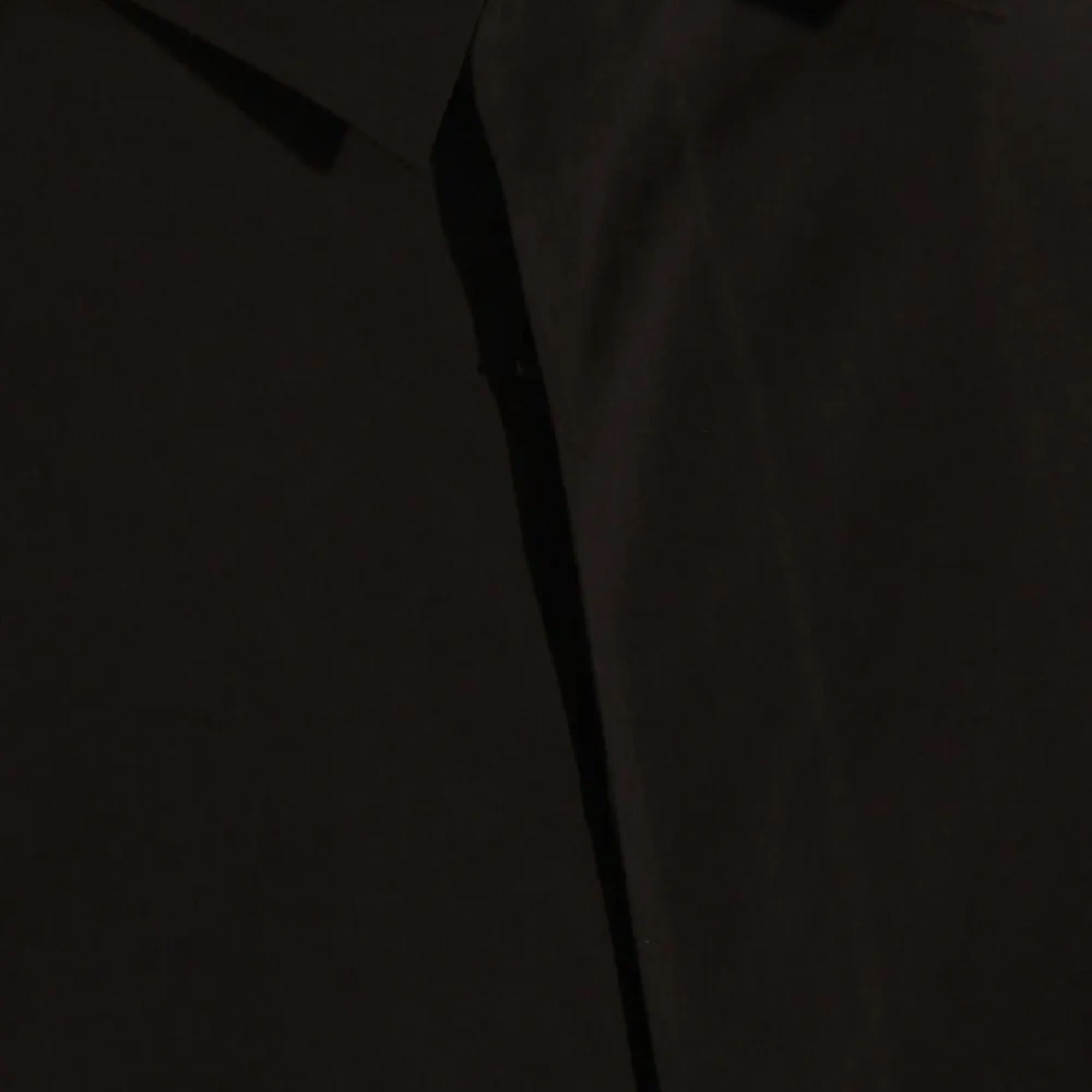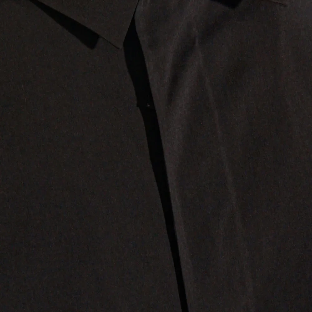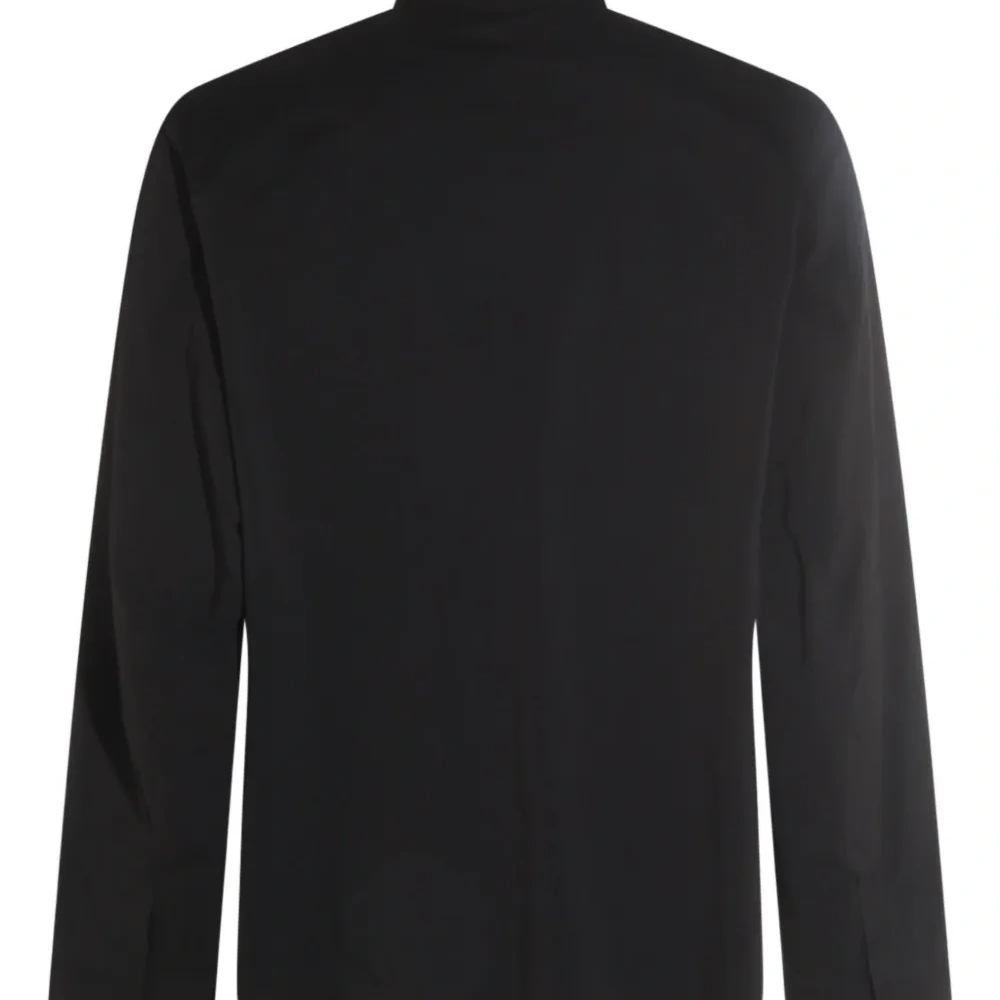 чёрная рубашка с длинными рукавами, застёжкой на пуговицы, отложным воротником и прямым подолом