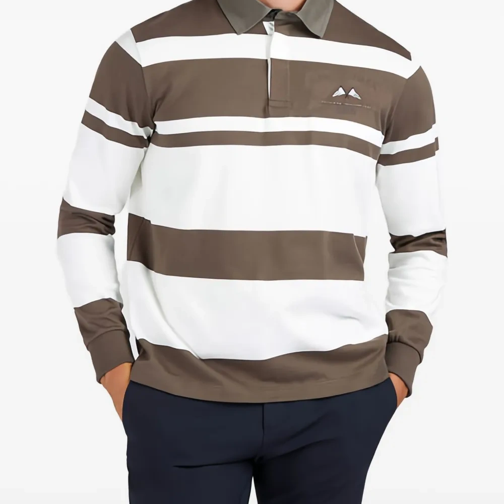 хлопковая футболка-поло с длинными рукавами, горизонтальными полосами в оттенках off-white и коричневого, вышитым логотипом