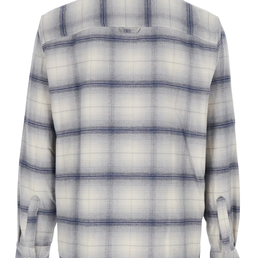 серо-синяя рубашка в клетку с классическим воротником, длинными рукавами, застежкой на пуговицы спереди и манжетами на пуговицах