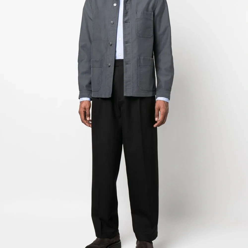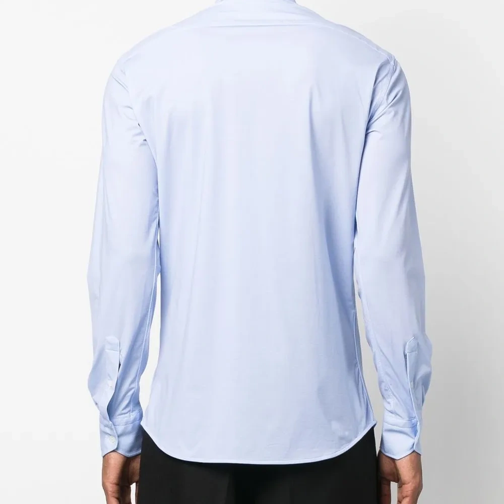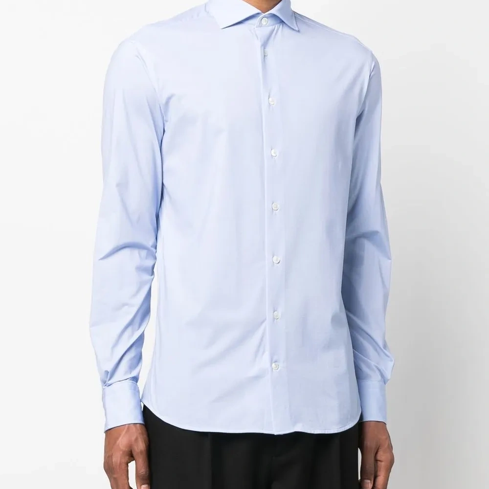 Голубой, классический воротник, застежка на пуговицах спереди, длинные рукава и закругленный подол.