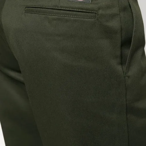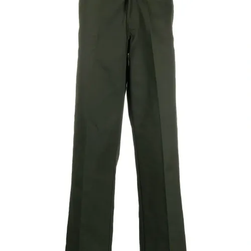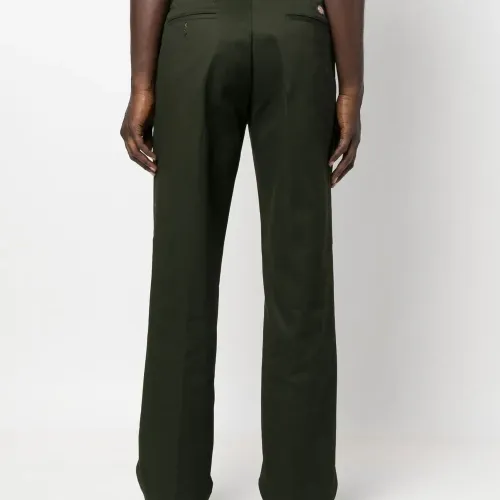 Оливково-зеленый, смесовый хлопок, нашивка с логотипом сзади, потайная застежка спереди, два кармана по бокам, два кармана с листочкой сзади и прямой крой.