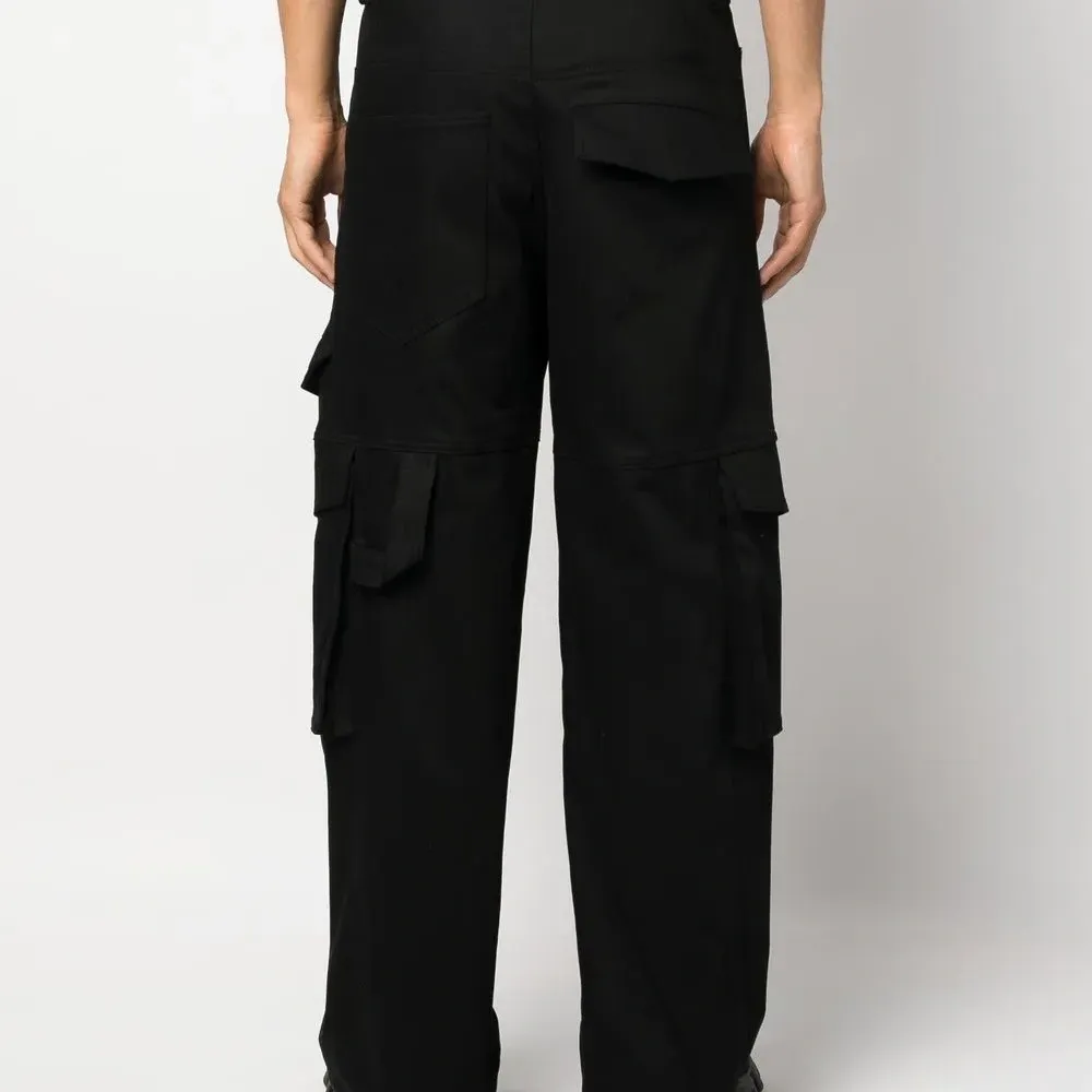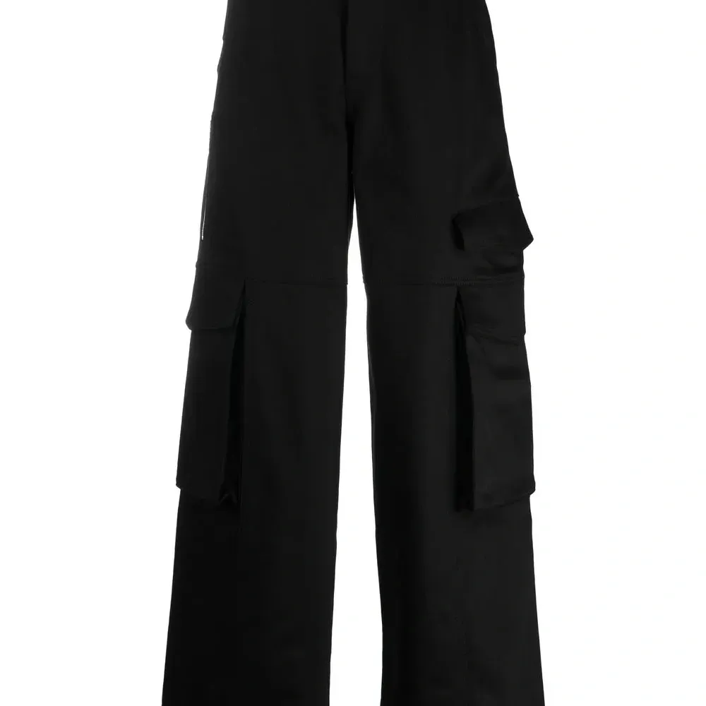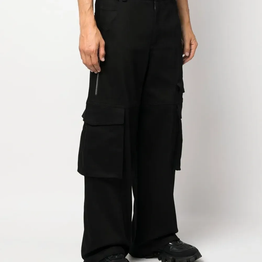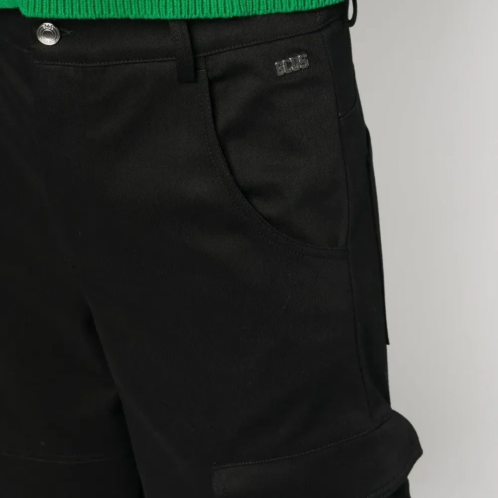 Черный, эластичный хлопок, нашивка с логотипом сзади, потайная застежка на молнии и пуговицах, средняя посадка, петли для ремня и накладные карманы.