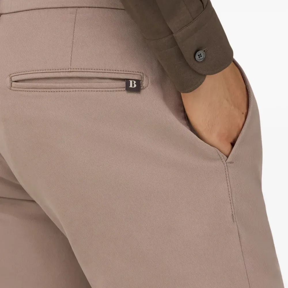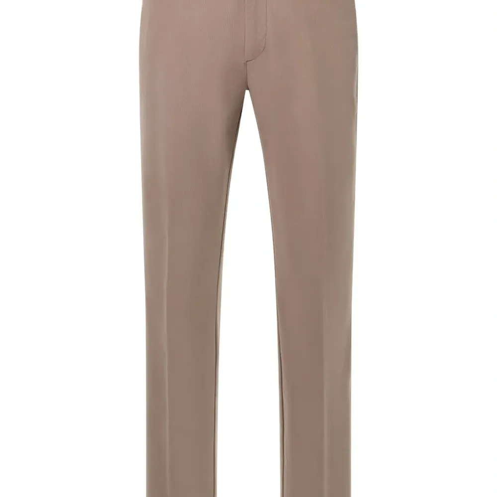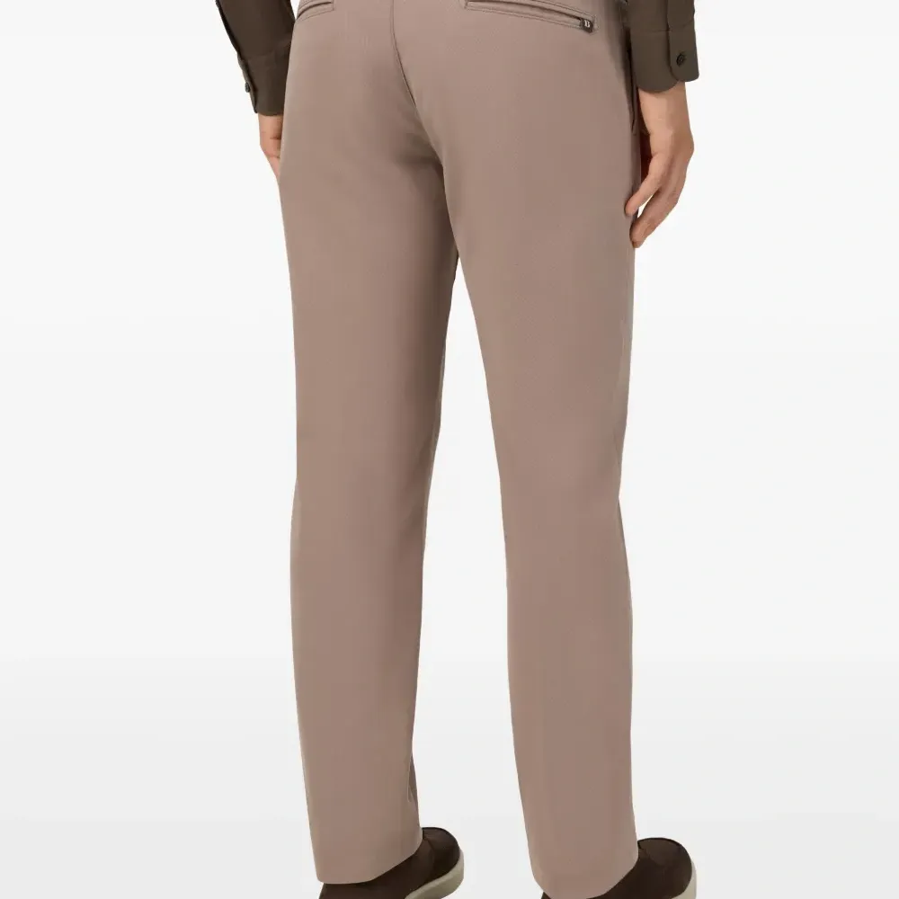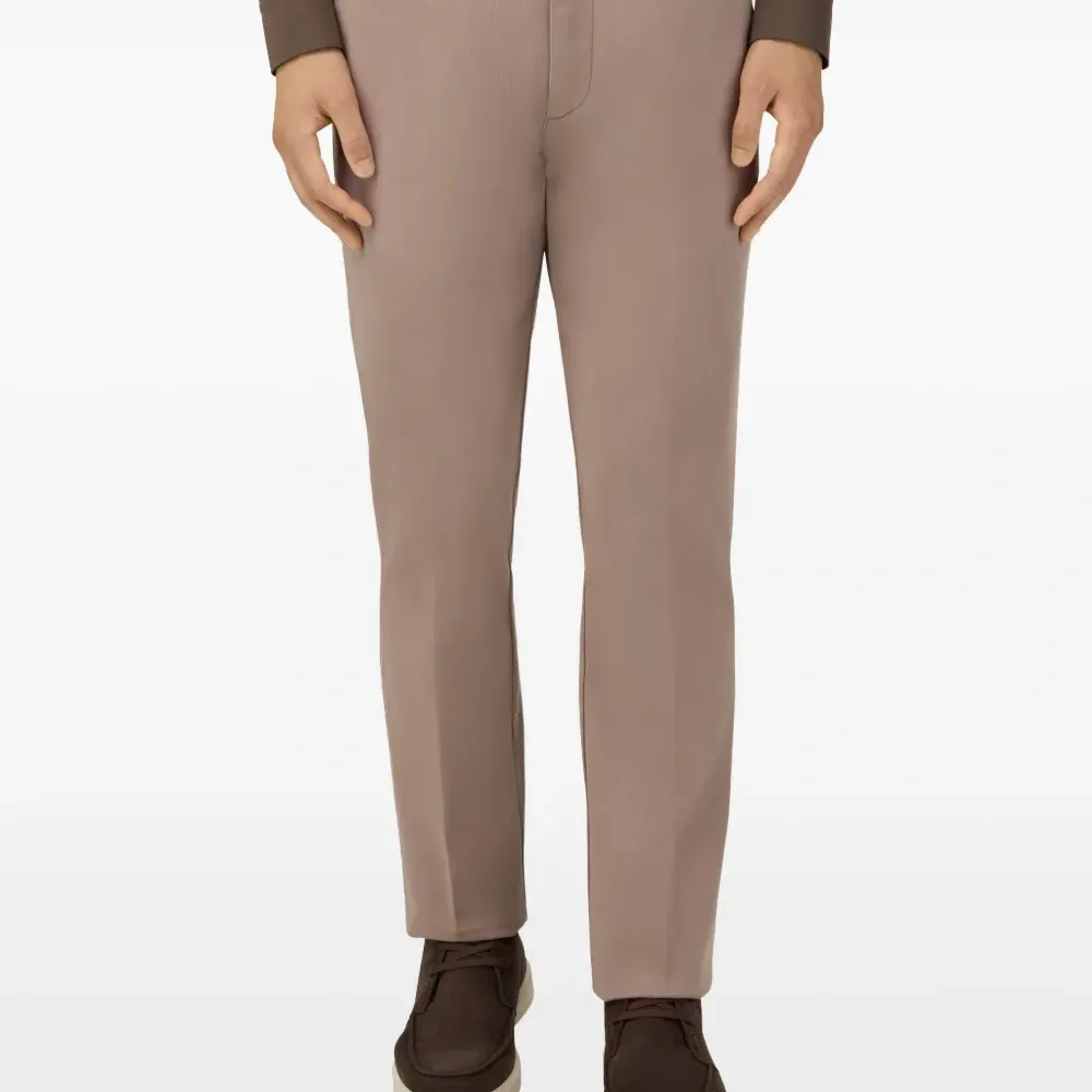 Брюки из эластичного хлопка. Модель с застежкой-молнией и пуговицей, диагональными передними карманами и задними карманами.