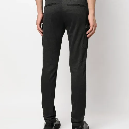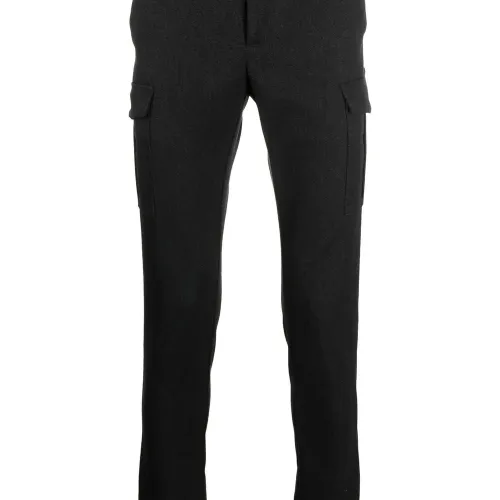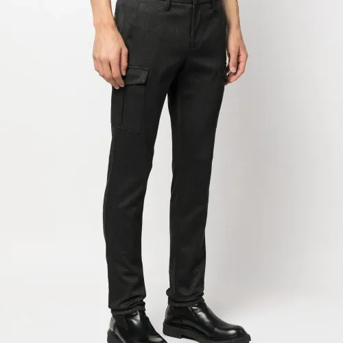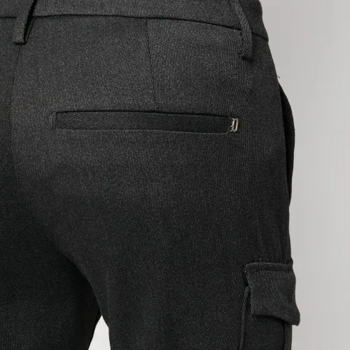 Темно-серый, два накладных кармана по бокам, потайная молния спереди, петли для ремня, два прорезных кармана по бокам, два кармана с листочкой сзади и прямой крой.