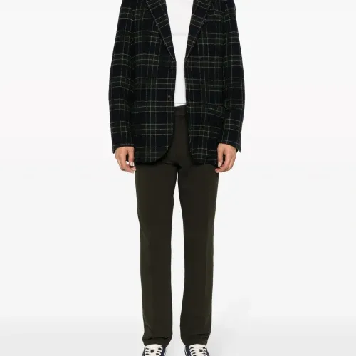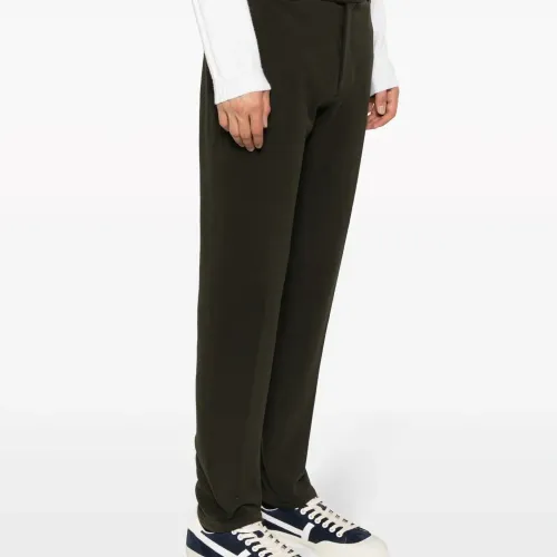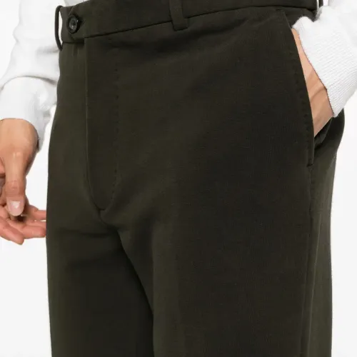 Темно-зеленый, эластичный хлопок, петли для ремня, два прорезных кармана по бокам, два кармана с листочкой сзади, застежка на пуговицах спереди и прямой крой.