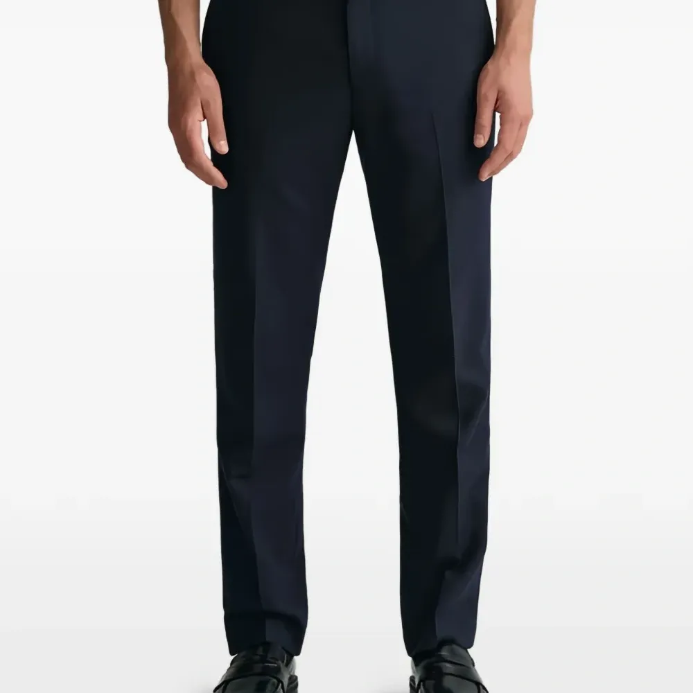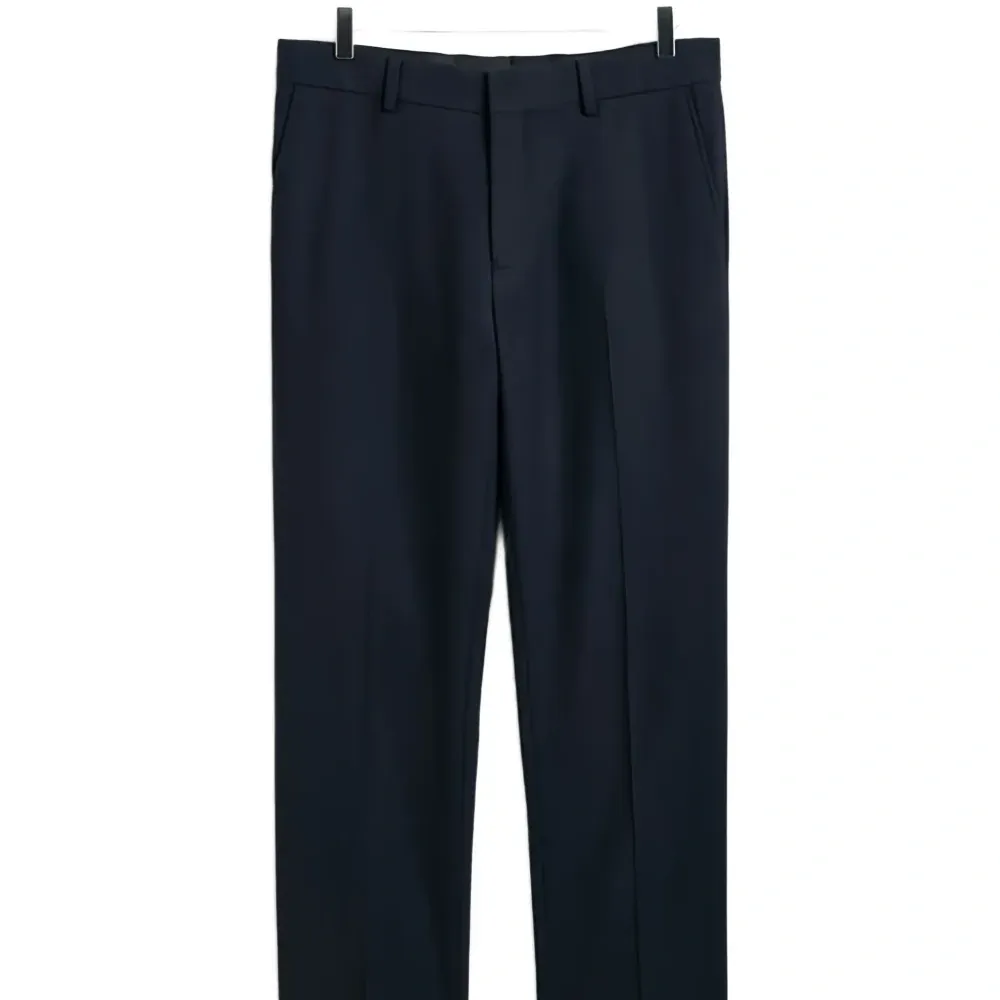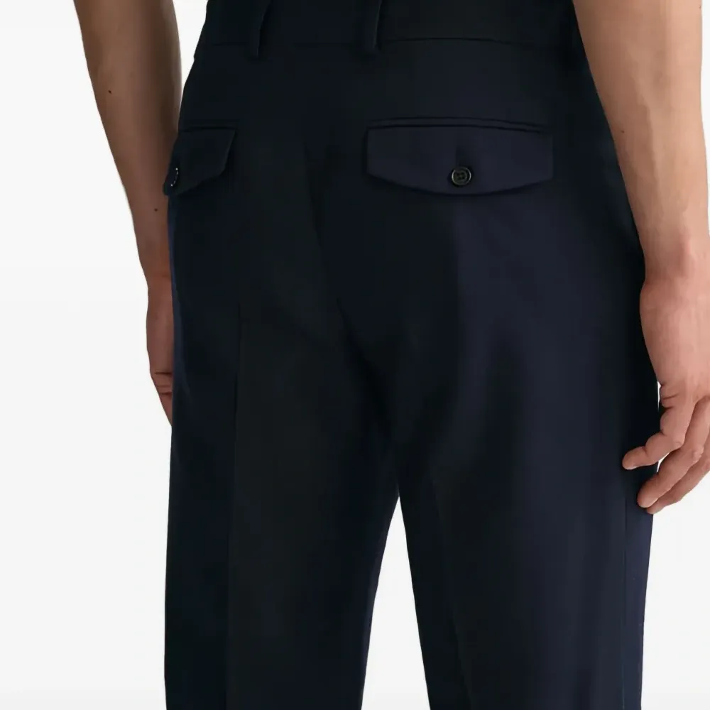 синие шлевки для ремня, застежка на пуговицу, задние карманы на пуговицах, боковые карманы в швах
