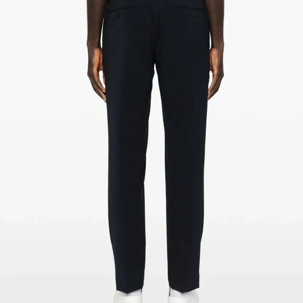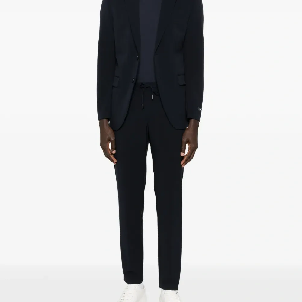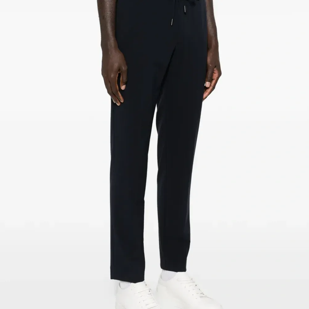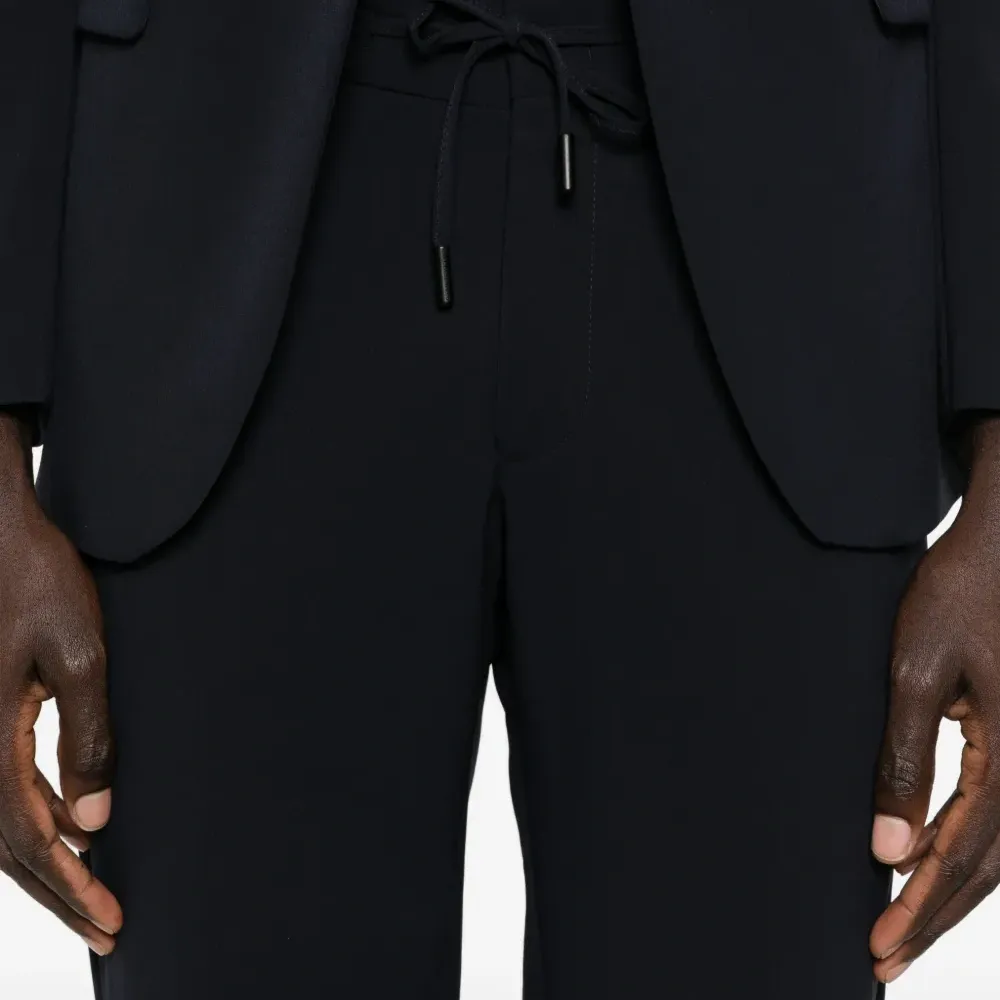 темно-синий цвет, шнурок для затяжки, боковые карманы в швах, задние прорезные карманы, тональная строчка, обычный крой