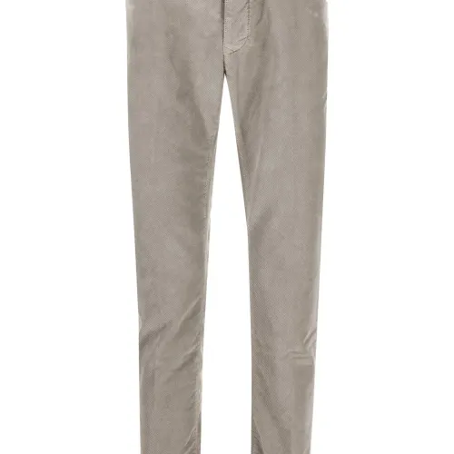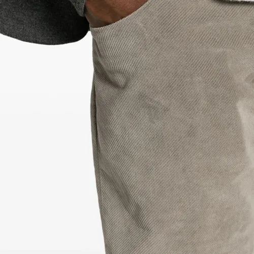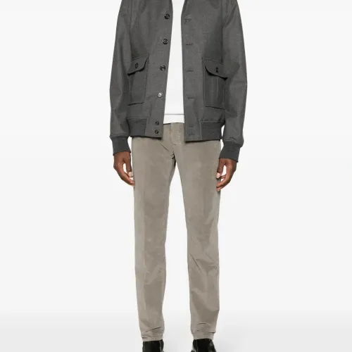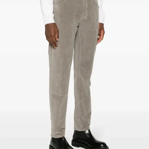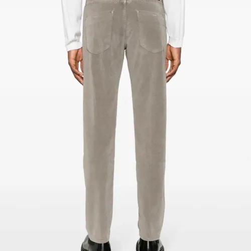 Серо-коричневый, эластичный хлопок, петли для ремня, нашивка с логотипом сзади, узкий крой, смещенная застежка на пуговицах спереди, пять карманов и прямой подол.