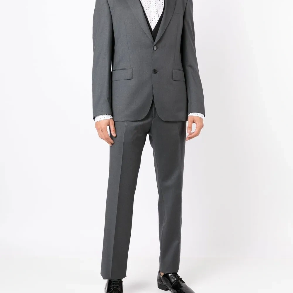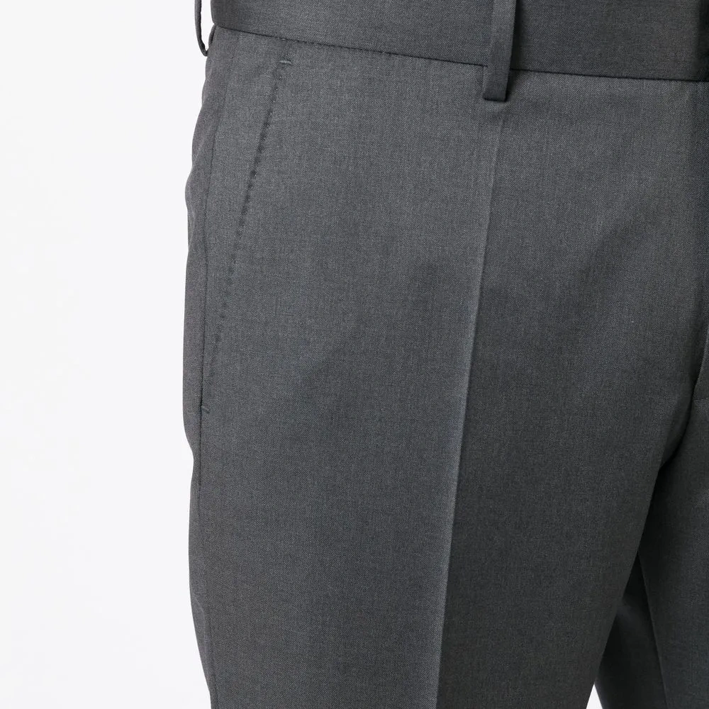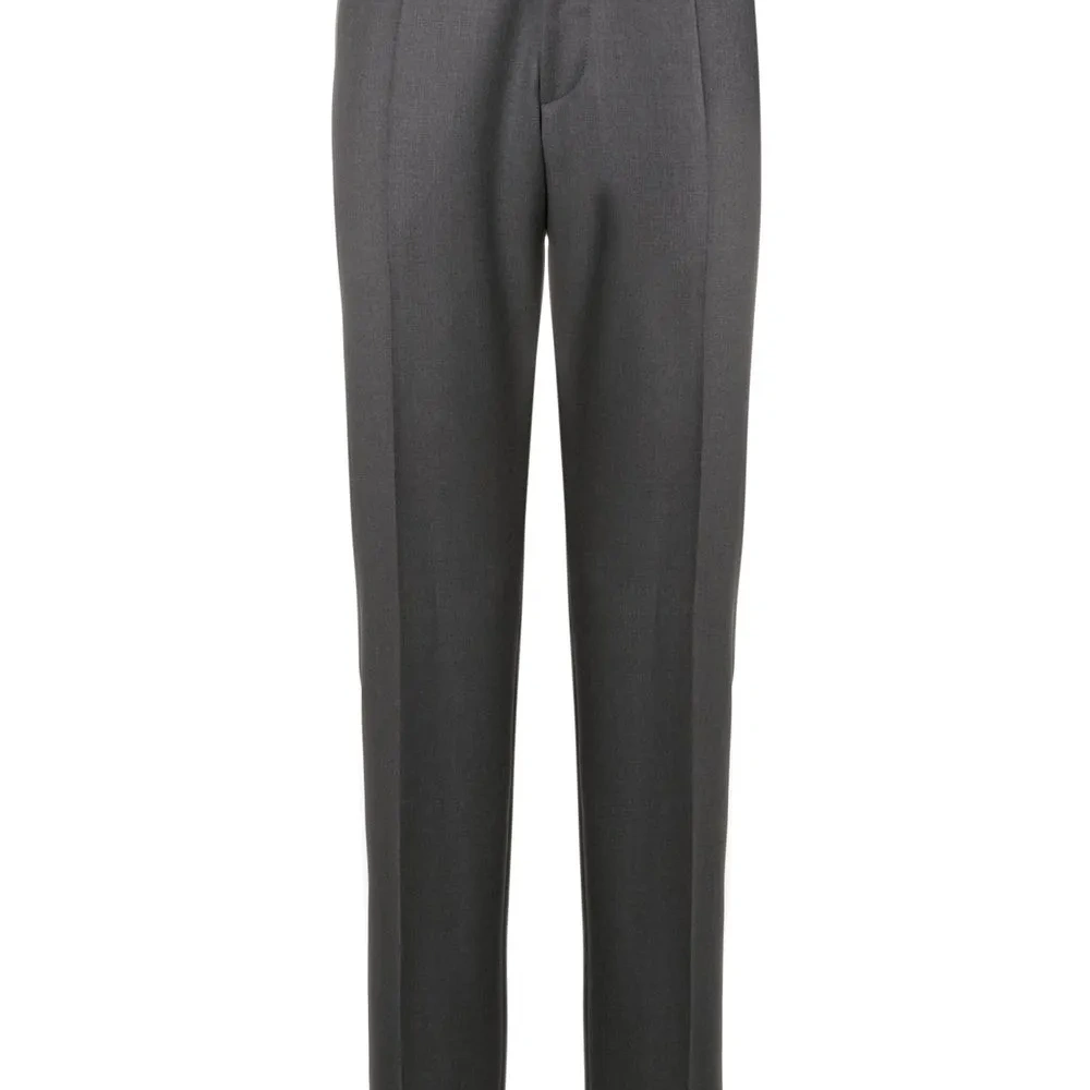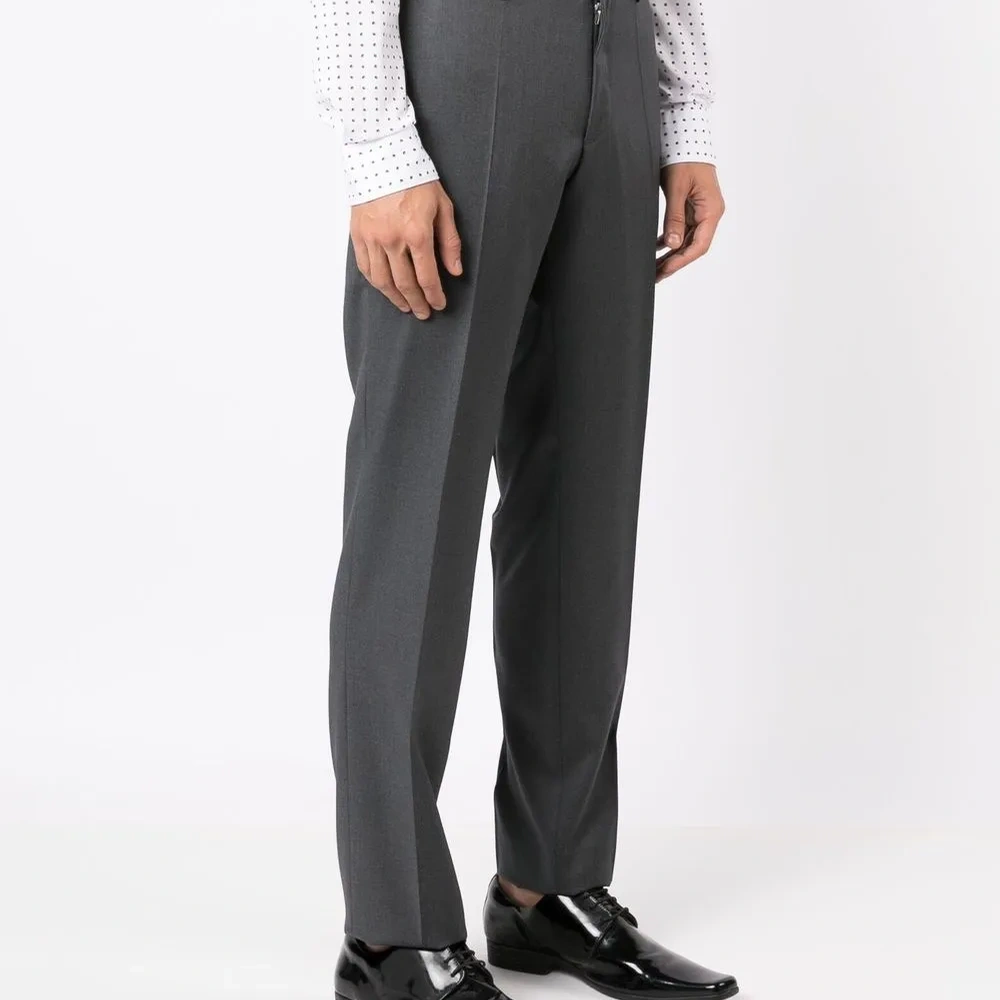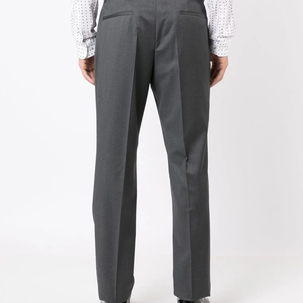 Серый, необработанная шерсть, прямой крой, потайная застежка, петли для ремня, два прорезных кармана по бокам и два кармана с листочкой сзади.