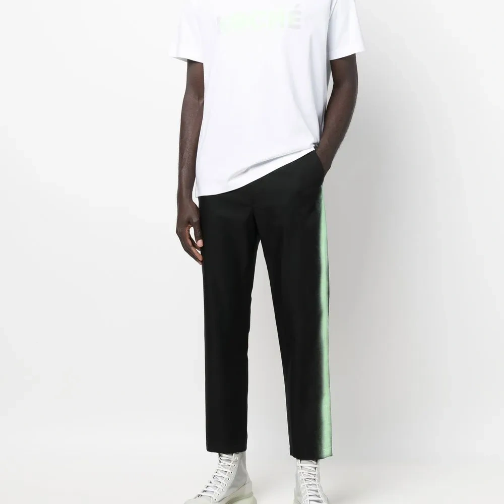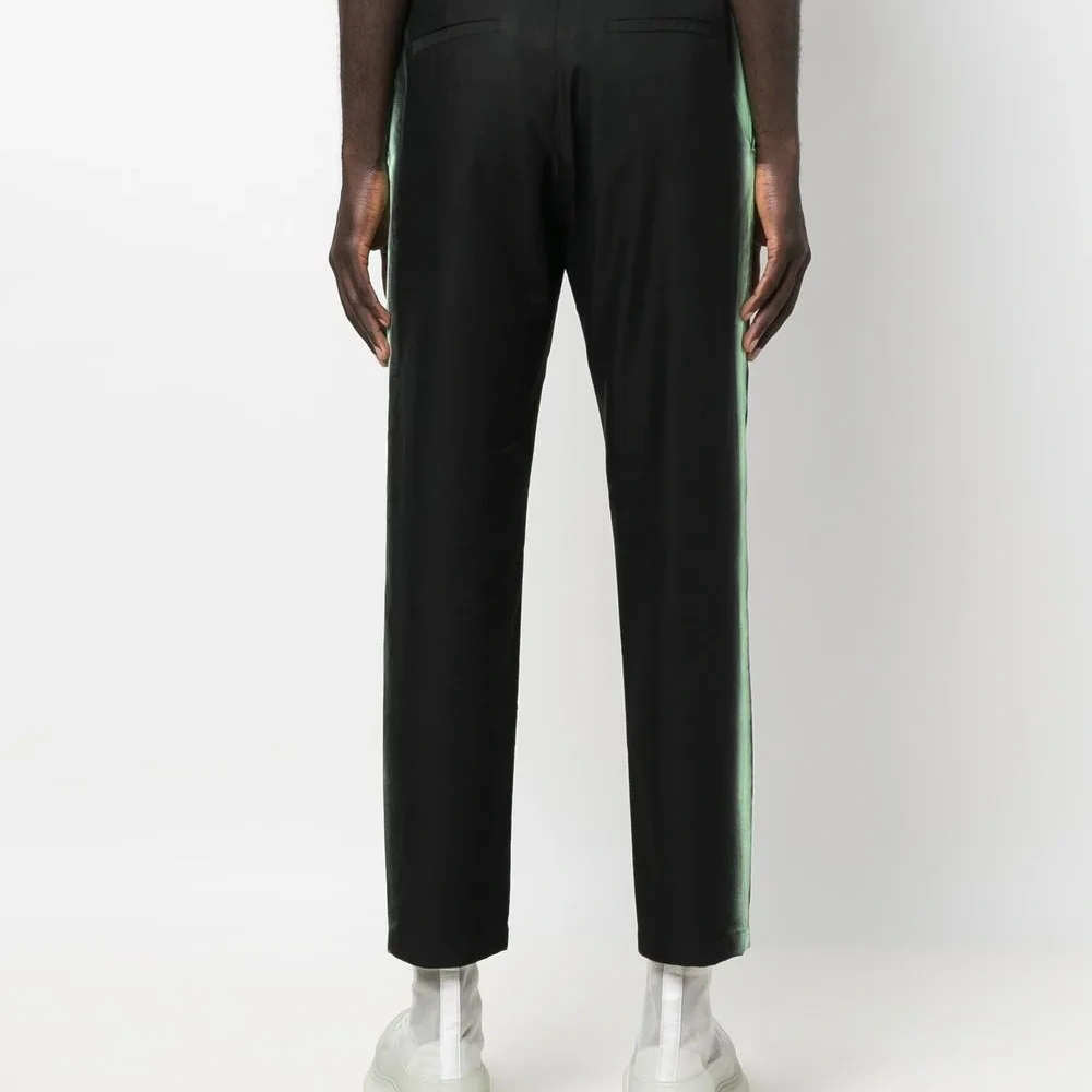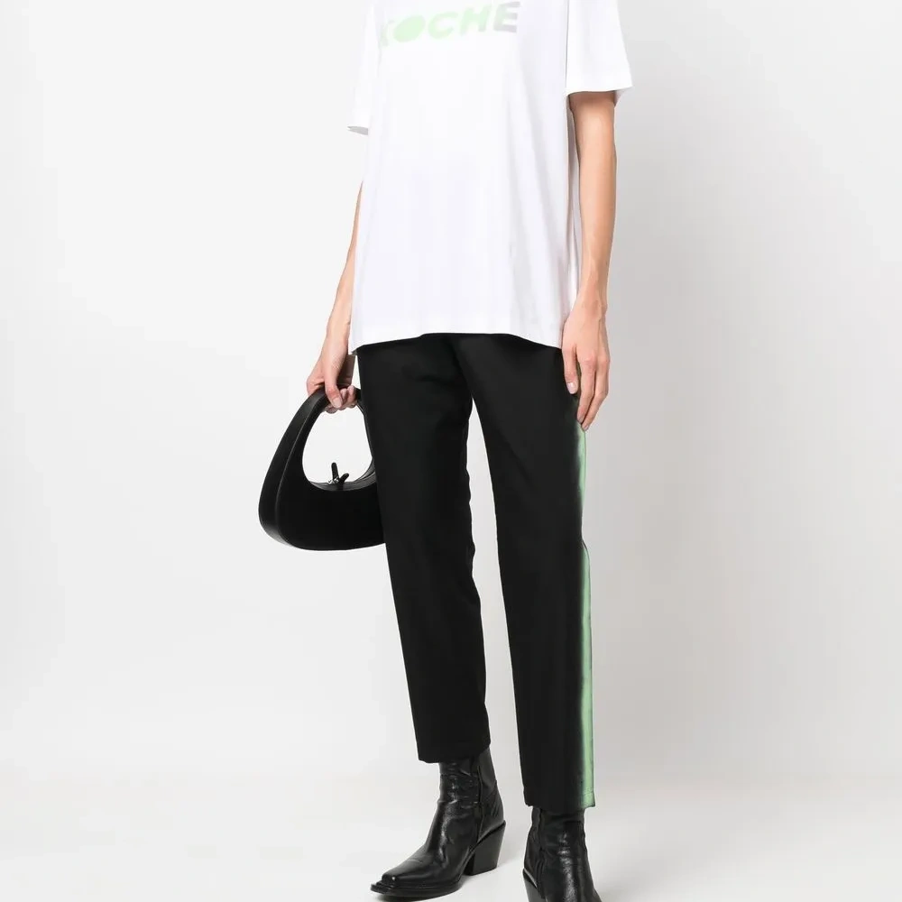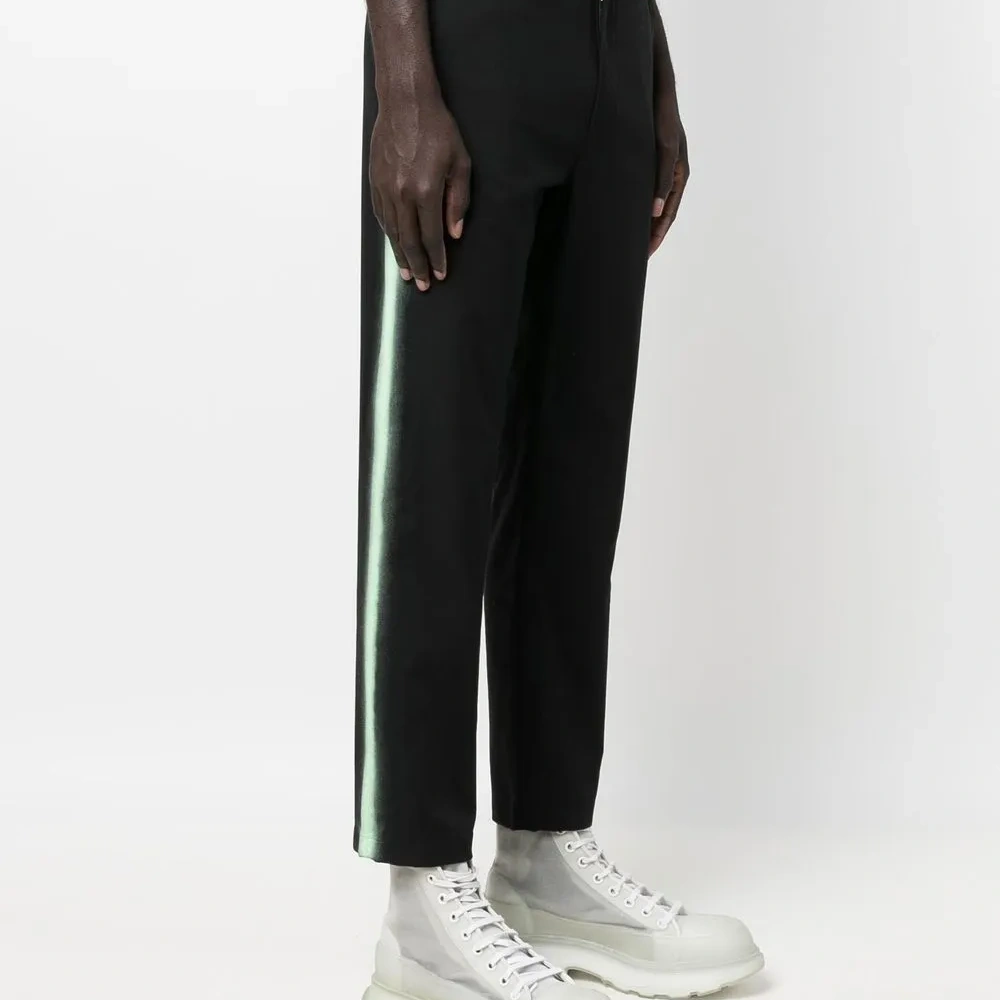Черный, смесовый хлопок, средняя посадка, прямой крой, укороченная длина, полоска сбоку, потайная молния спереди, эластичный пояс, два прорезных кармана по бокам, два кармана с листочкой сзади и прямой подол.