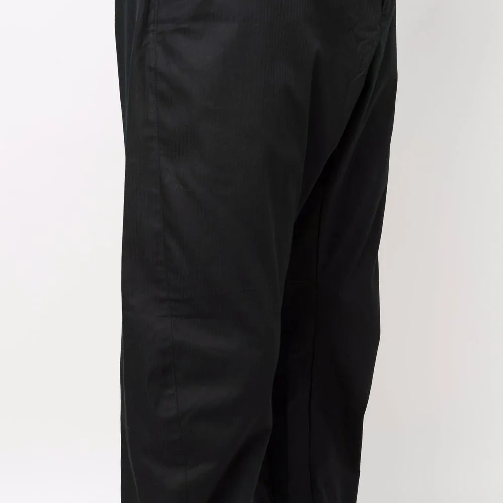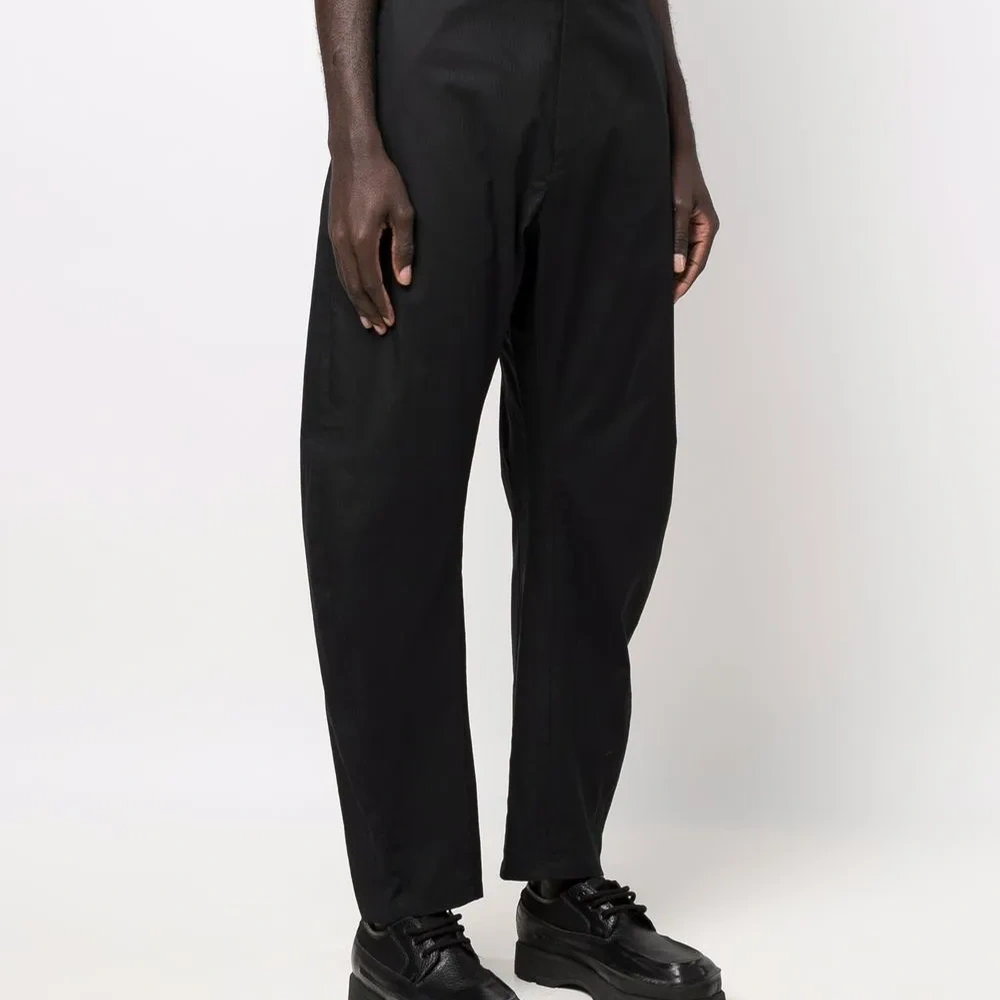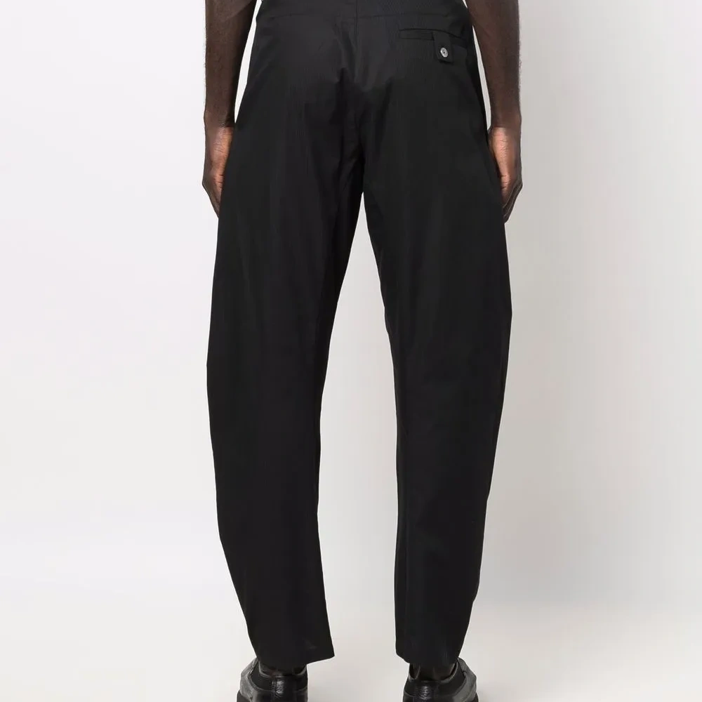 Средняя посадка, петли для ремня, потайная пуговичная застежка спереди, два кармана по бокам и карман на пуговице сзади. Цвет: черный.