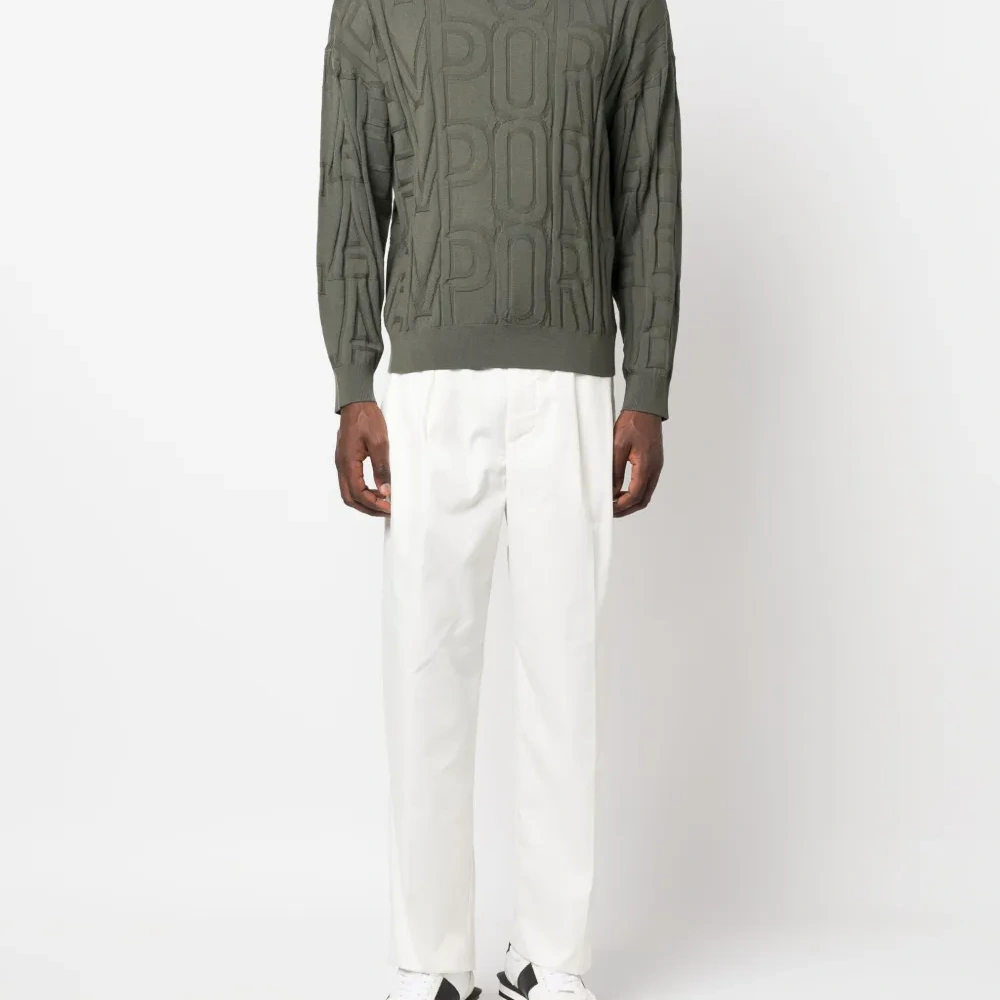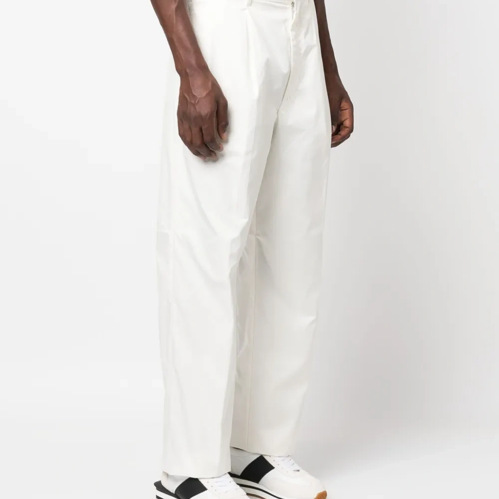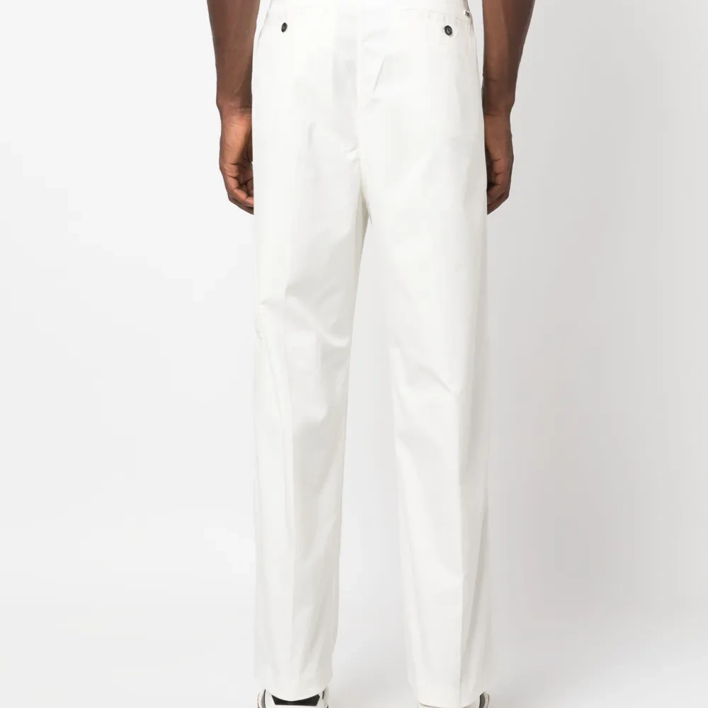 Цвет слоновой кости, хлопок, средняя посадка, встречная складка, петли для ремня, потайная застежка спереди, два прорезных кармана по бокам, два кармана на пуговице сзади и прямой крой.
