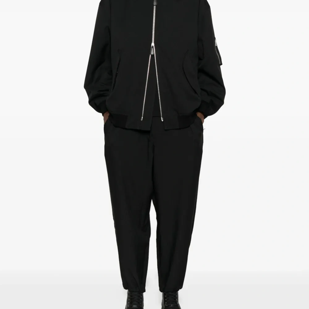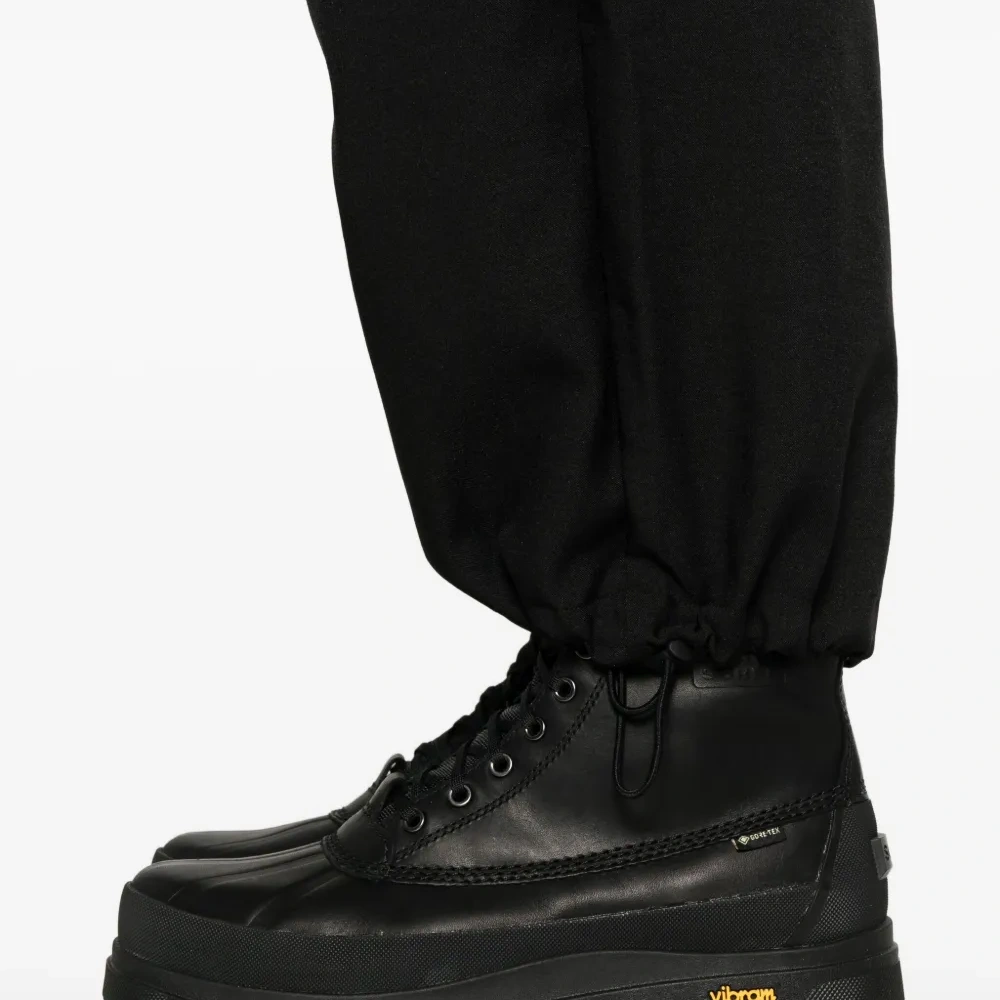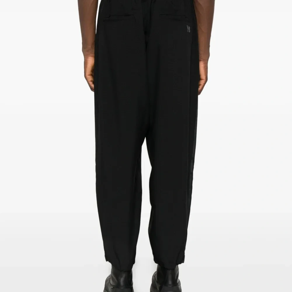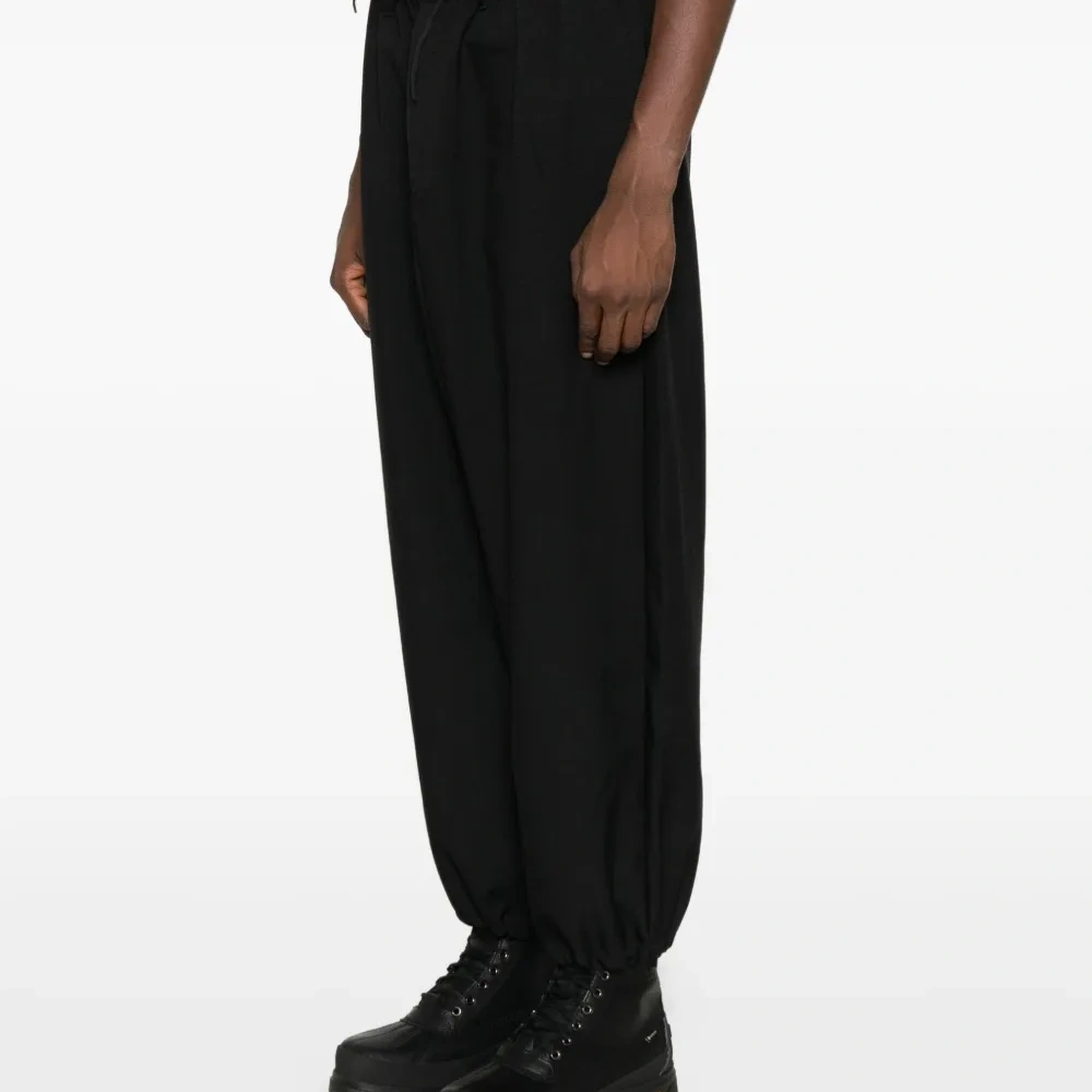 черный, фактурный эффект, эластичный пояс на кулиске, два боковых прорезных кармана, прямые брючины