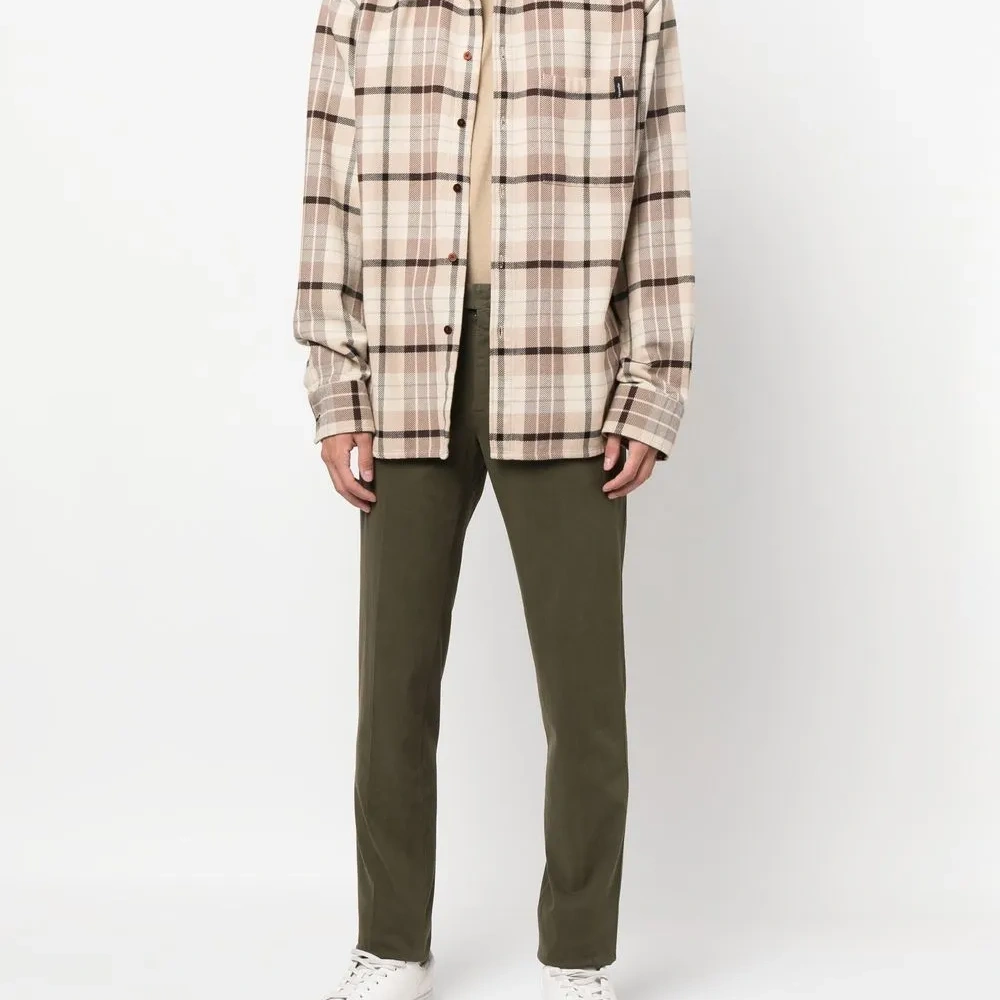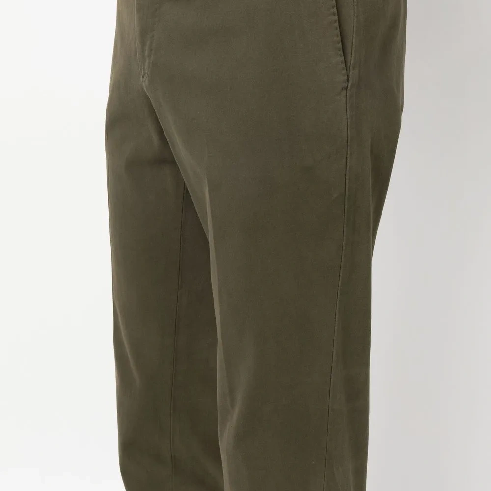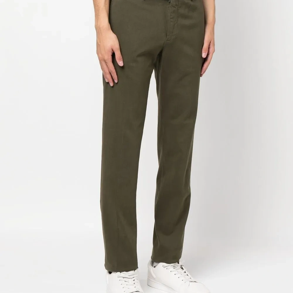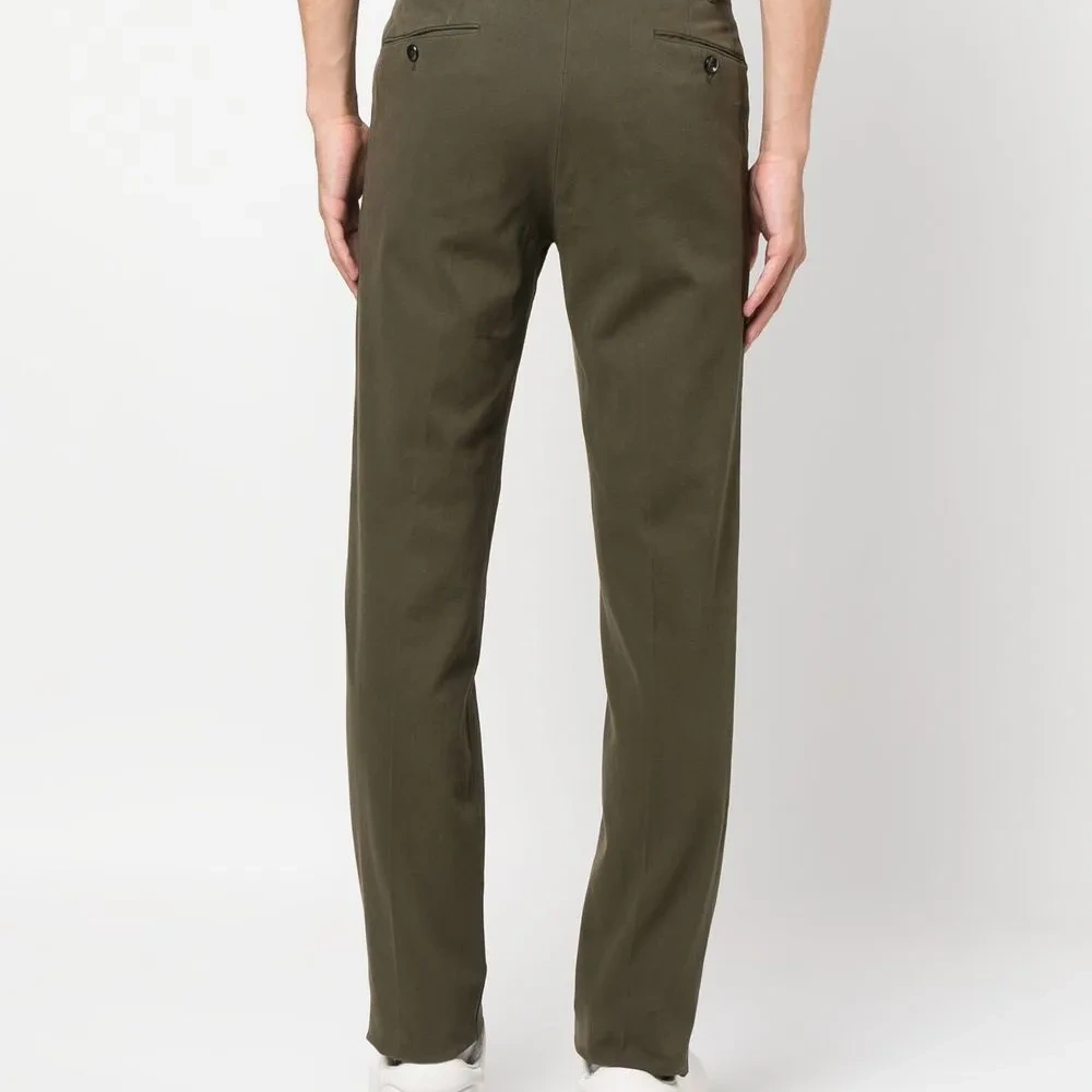Хаки, петли для ремня, застежка на молнии и пуговице спереди, два прорезных кармана по бокам, два кармана с листочкой сзади и прямой крой.