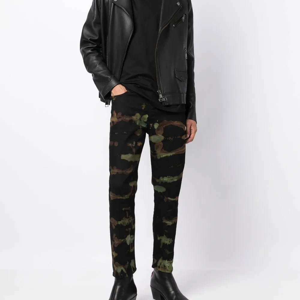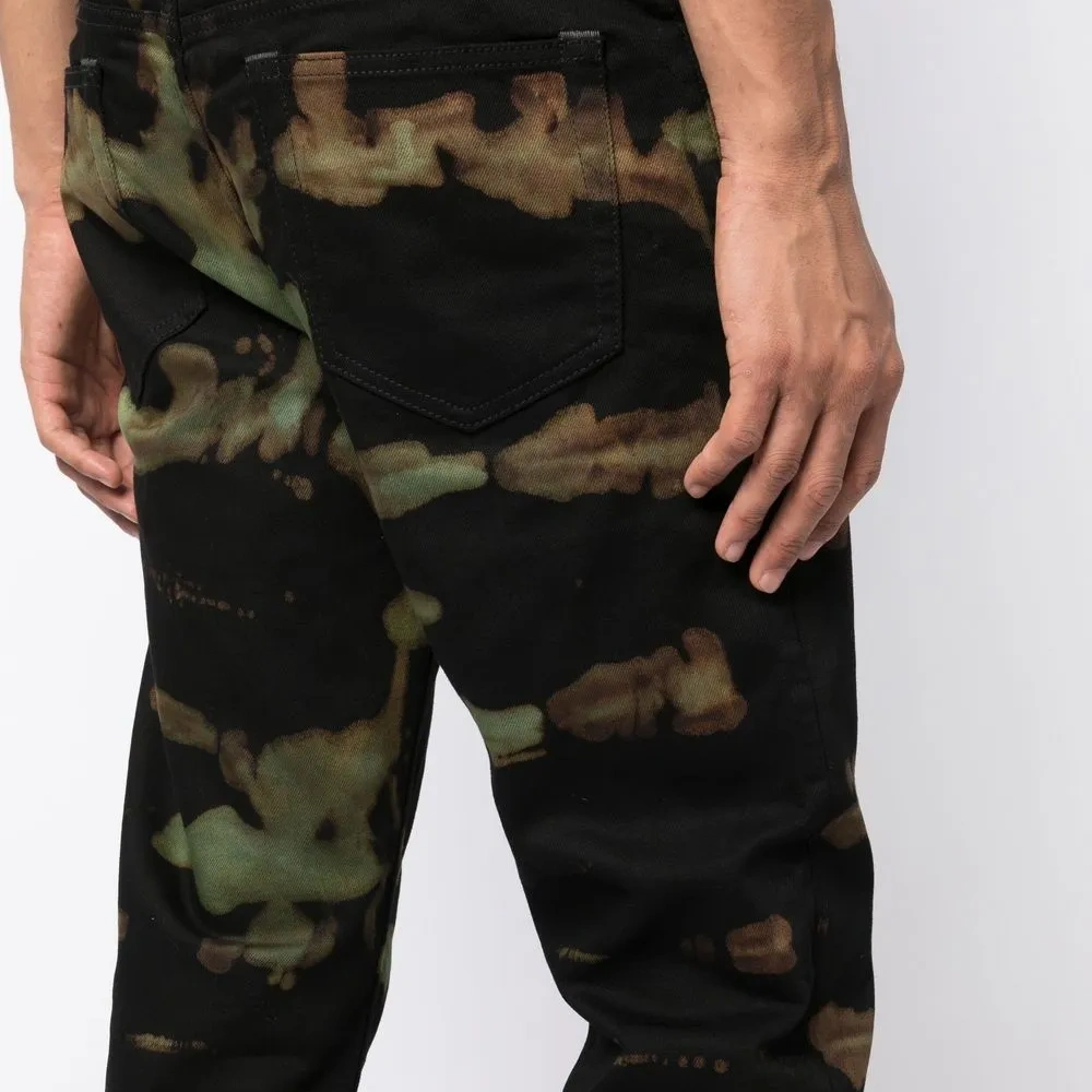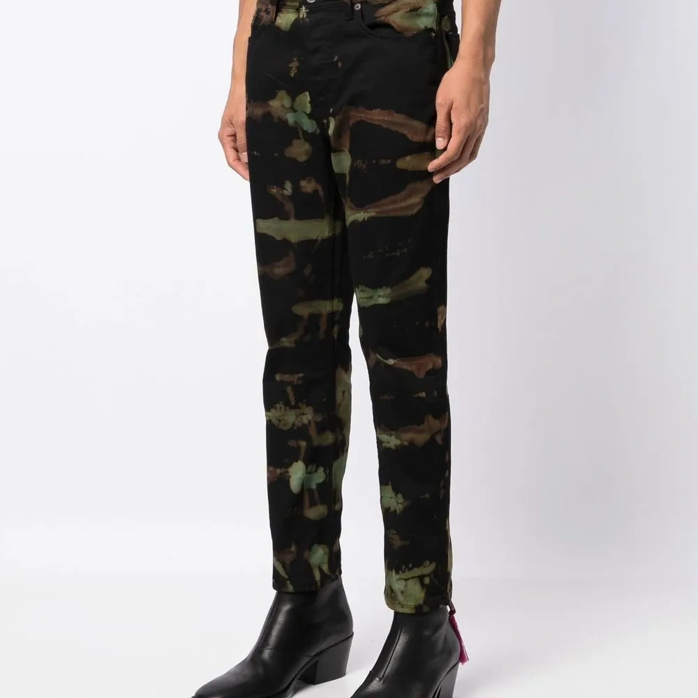Смесовый хлопок, абстрактный принт, эффект обесцвечивания, нашивка с логотипом сзади, петли для ремня, застежка на молнии и пуговице спереди, пять карманов и прямой крой.